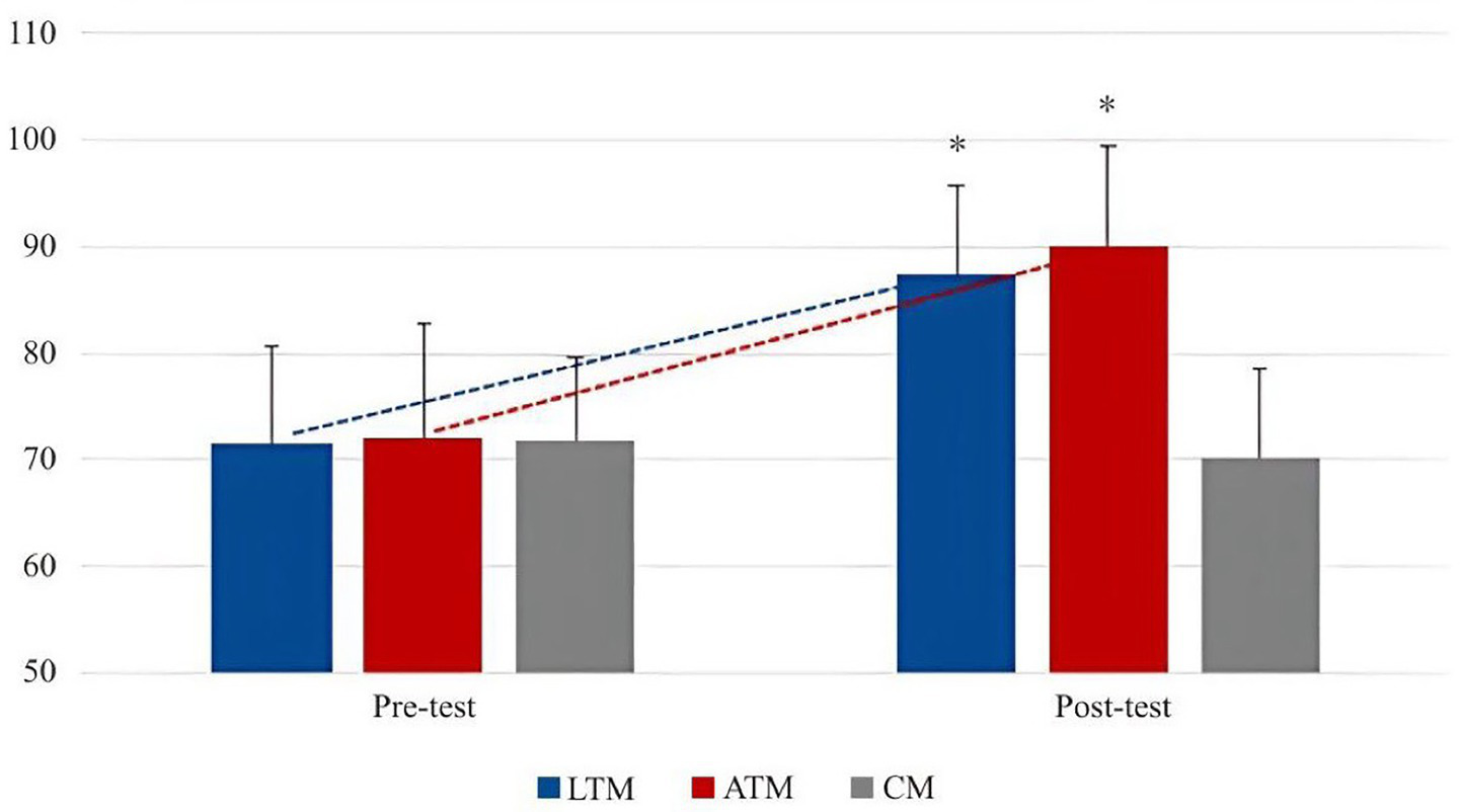 | AB | LTM | 14.25 ± 3.65 | 17.25 ± 3.82 | 2.341 | <0.05* |