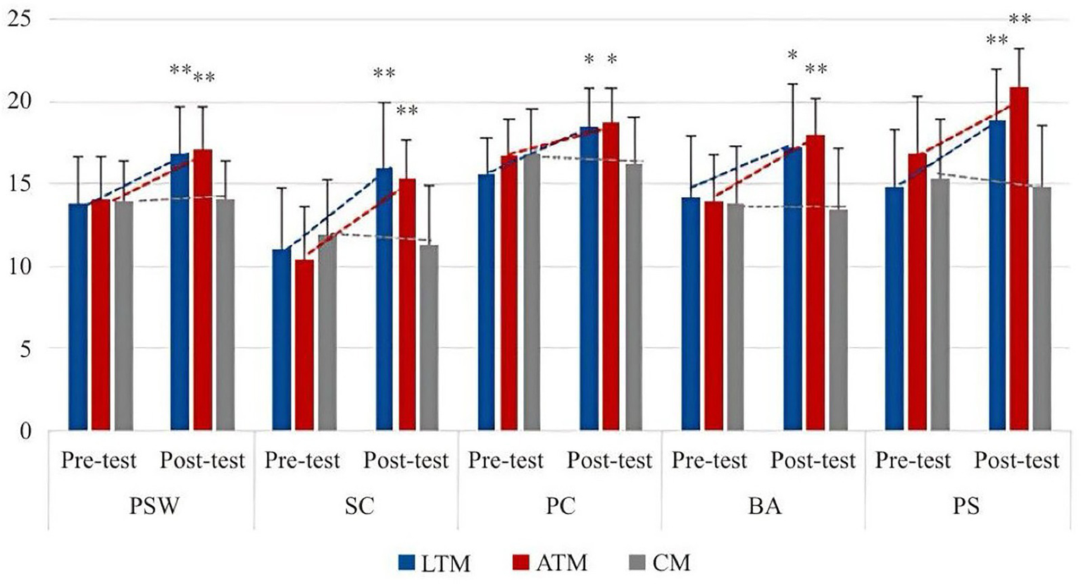 | PSW | LTM | 13.87 ± 2.79 | 16.87 ± 2.82 | 2.342 | <0.05* |