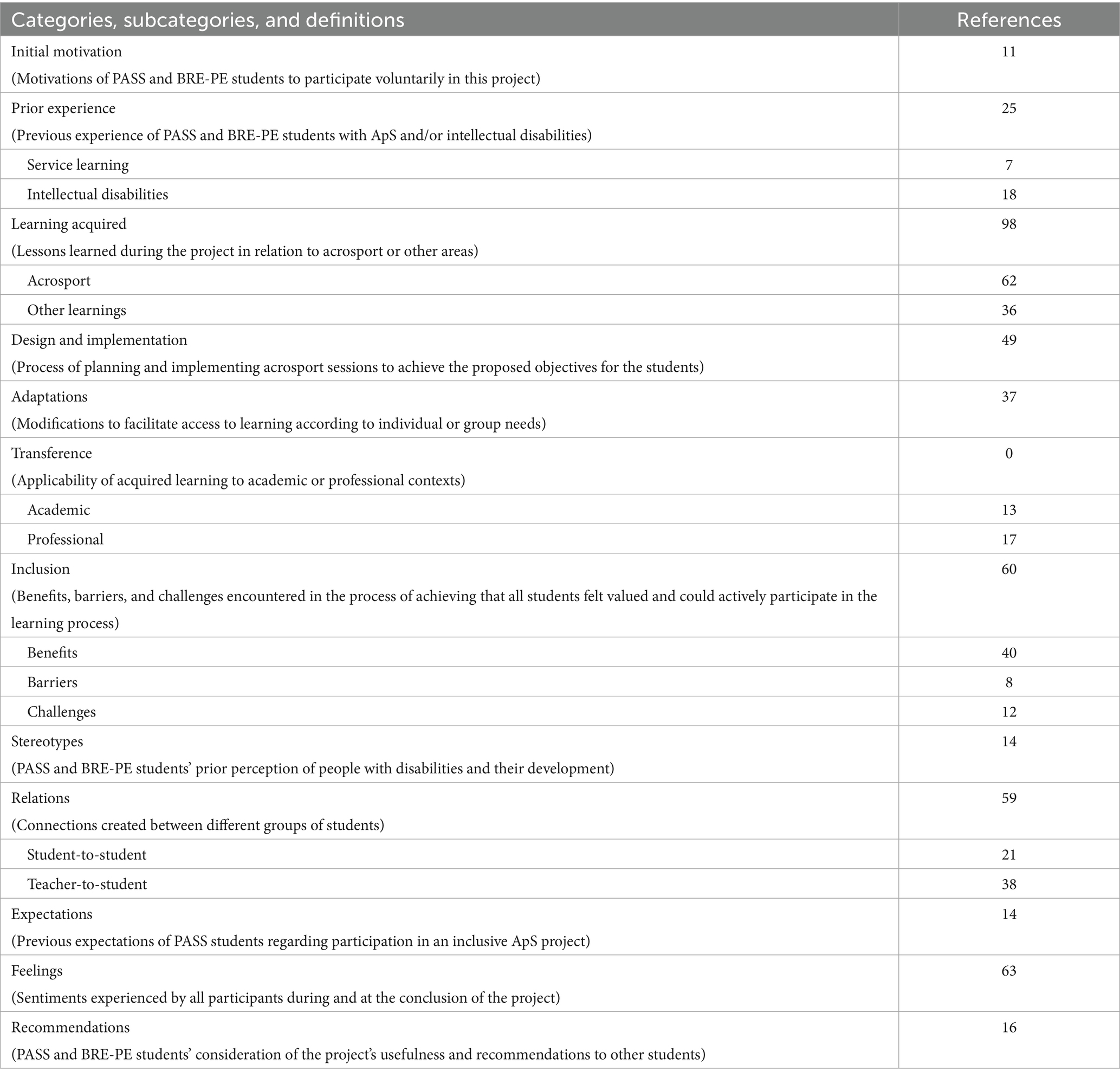 Regarding the learning of content, it stands out that the students with intellectual disabilities who received the service said that they acquired a lot of knowledge, including learning to value working as a team (Kefallinou et al., 2020; Oh-Young and Filler, 2015). In addition to the above, the students who provided the service said that they learned more meaningful knowledge about the content than they did during the delivery of the module because they could apply it in real situations and because their participation in the project helped them reflect on their own teaching practise (García-Rico et al., 2023; Marttinen et al., 2020; Santiago et al., 2020). Finally, the students without disabilities who received the service said that they had developed learning relating to acrosport. These students also reported that this inclusive experience made them reflect on their own practise as future education professionals, including in their role as service receivers.