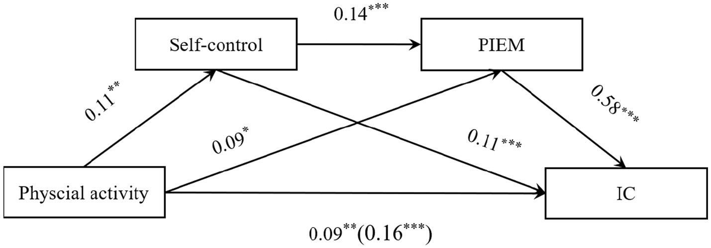 The results of the regression analysis (Table 3) show that physical activity significantly and positively predicted college students’ IC (β = 0.16, p < 0.001). Further, after including self-control and PIEM in the regression equations, physical activity significantly and positively predicted self-control (β = 0.11, p < 0.01) and PIEM (β = 0.09, p < 0.05); self-control significantly positively predicted PIEM (β = 0.14, p < 0.001) and IC (β = 0.11, p < 0.001); and PIEM significantly positively predicted IC (β = 0.58, p < 0.001), at which point physical activity continued to be a significant predictor of IC (β = 0.09, p < 0.01).