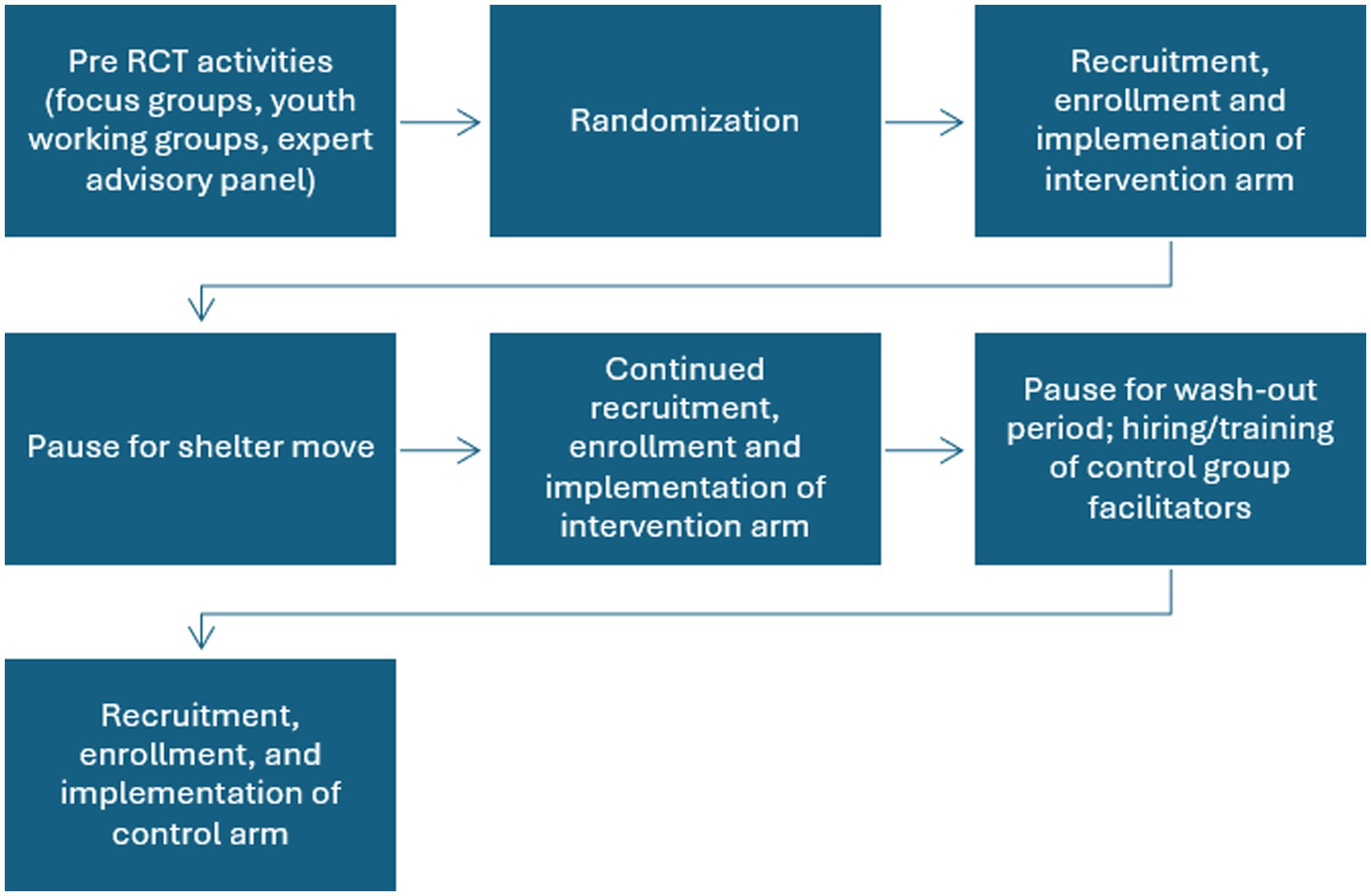 The order of the conditions, not the individual, was randomized in a one-stepped wedge design with the intervention group being offered first followed by the control condition. During the 17 months of recruitment, 5 months were not active due to the shelter being demolished and relocated to a temporary facility and the planned washout period (3 months) between recruitment into the two groups. Once the shelter had reached at least a 50% resident turnover, youth were recruited for the control arm. This was assessed by viewing the resident roster to determine when there was less than 50% of the same residents at the time of enrollment (Figure 1).