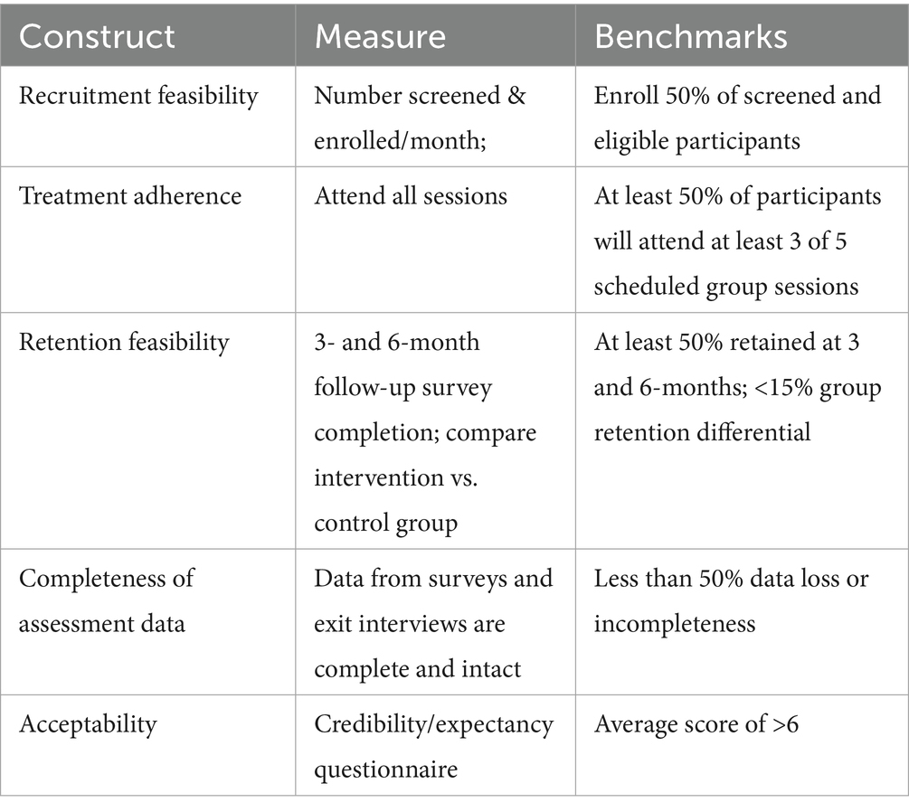 Feasibility and acceptability measures were collected to determine if a priori benchmarks were met (Table 1). Recruitment, treatment adherence, and retention benchmarks were chosen considering the highly variable lengths of stay for young adults in a shelter. The study aimed to enroll 50% of all screened and eligible participants, expose at least 50% of participants to three out of five group sessions, and retain at least 50% of participants at the 3- and 6- months post-follow-up with a group retention differential less than 15%, attain less than 50% of data loss, and achieve over 6 on the credibility and expectancy questionnaire scale (Devilly and Borkovec, 2000). Setting a minimum of three sessions for the participation benchmark was informed by previous studies that found significant intervention effects even without exposure to an entire intervention curriculum (Biegel et al., 2009; Himelstein et al., 2012; Tucker et al., 2017).