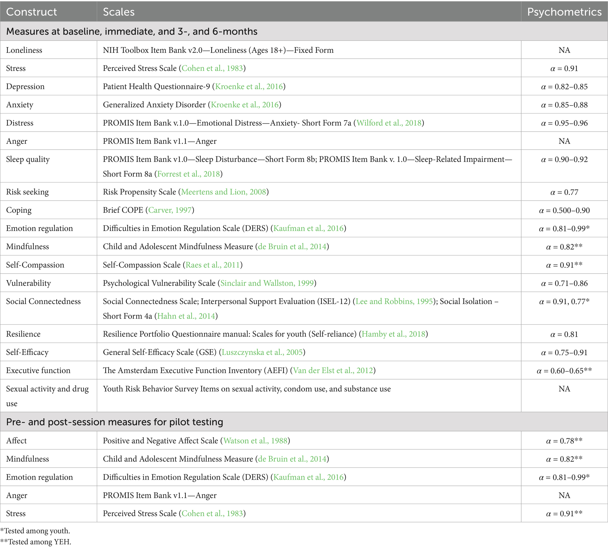 Measures chosen to assess emotional and psychological well-being were informed by the study team, expert advisors, and cognitive interviews with the youth working group. The final baseline, immediate-, 3-, and 6-month follow-up surveys included scales to assess loneliness, stress (PSS), depression (PHQ-9), anxiety (GAD), emotional distress, anger, sleep disturbance/impairment, risk propensity, coping, emotion regulation, mindfulness, self-compassion, psychosocial vulnerability, social connectedness, resilience, social isolation, self-efficacy, executive function, and risk behaviors (see Table 2). The surveys administered pre- and post-session contained the same scales to assess mindfulness, emotion regulation, and anger, a shortened scale to measure stress, and a scale to measure positive and negative affect. The semi-structured exit interview guide was developed to assess the overall experience of participating in the study, expectations and perceived outcomes of the program, facilitators and barriers of attendance, experience with the session facilitators, acceptability of program content and delivery modality, and feedback on outcome measures and survey format and length.