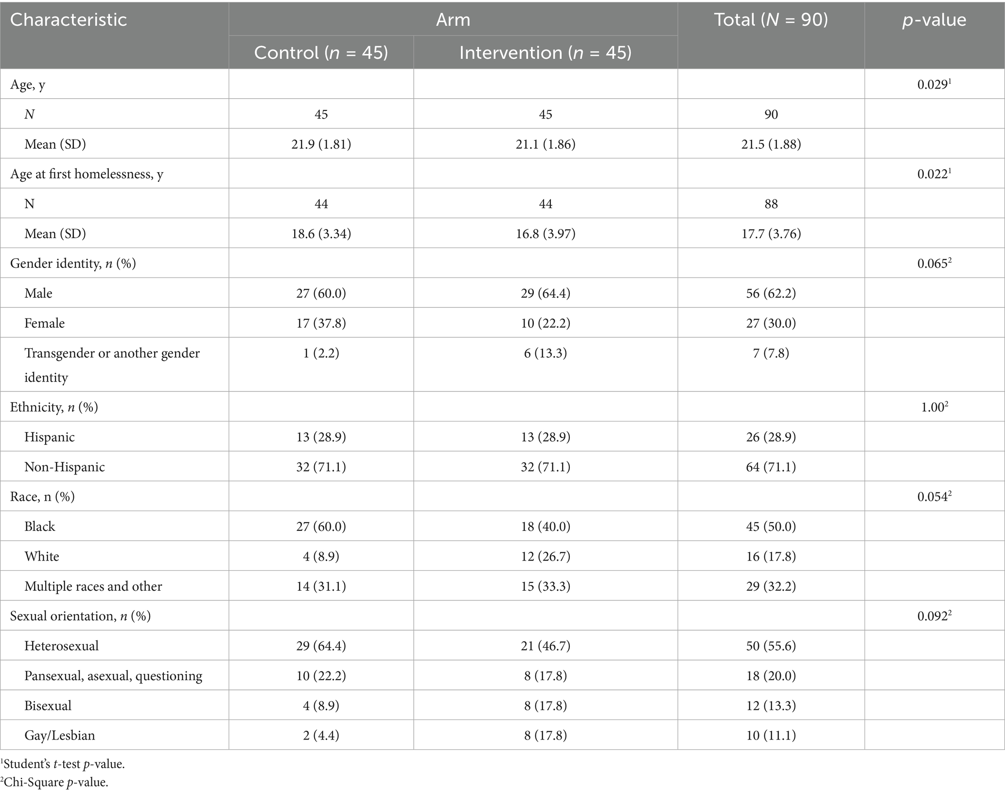 Participants were predominantly male (62.2%), non-Hispanic (71.1%), Black (50.0%), and heterosexual (55.6%). The mean age at enrollment was 21.5 and the mean age at first homelessness was 17.7. There were no significant differences in baseline characteristics between groups (Table 3).