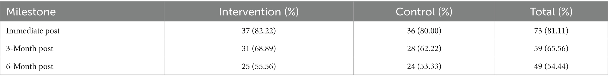 Follow-up data collection was challenging due to the transient nature of the participants. Twenty-five youth left the shelter during the study period. While youth were able to return to the shelter to participate in the sessions, transportation was a prohibitive factor for those housed through vouchers in apartments that were far from the shelter, or staying with family or friends who lived out of town. Aside from leaving the shelter, additional reasons for not completing the sessions may have been finding a job, enrolling in school or vocational program, or loss of interest. Further, the immediate post-survey was designed to be administered immediately after the last session. However, youth (n = 18) did not participate in the last session. Youth (n = 3) also left the shelter but returned months later for 3- and 6-month follow-ups. Despite these common realities of the lived experience of youth who are unhoused, benchmarks for retention were met (Table 4).
