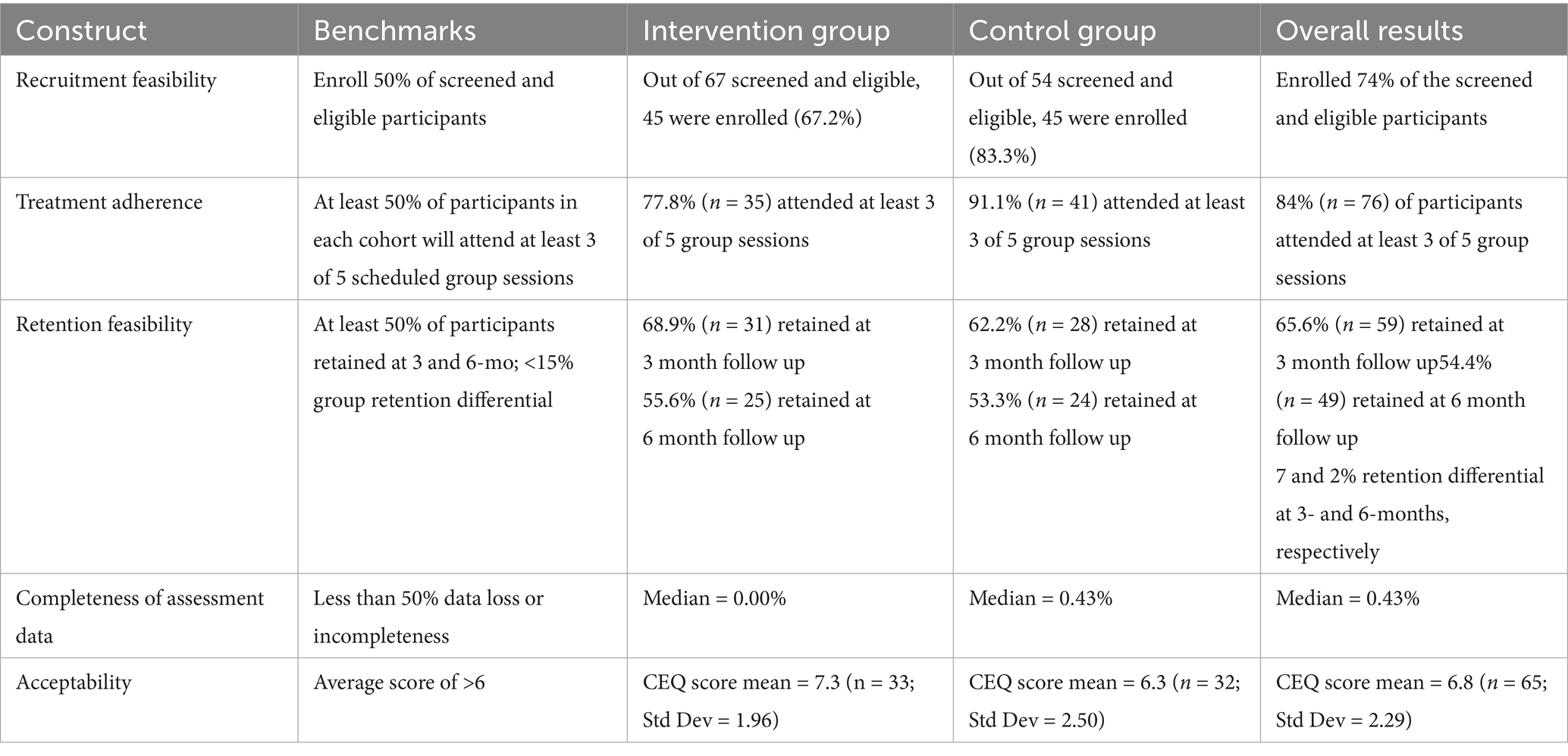 The Credibility/Expectancy (n = 33; mean = 7.3; Std Dev = 1.96) score (CEQ) for the intervention group indicated that the adapted curriculum was acceptable. An acceptable CEQ score for the control group (n = 32; mean = 6.3; Std Dev = 1.96) score (CEQ) indicates the control program was also acceptable for this sample. A summary of feasibility and acceptability outcomes are outlined in Table 5.