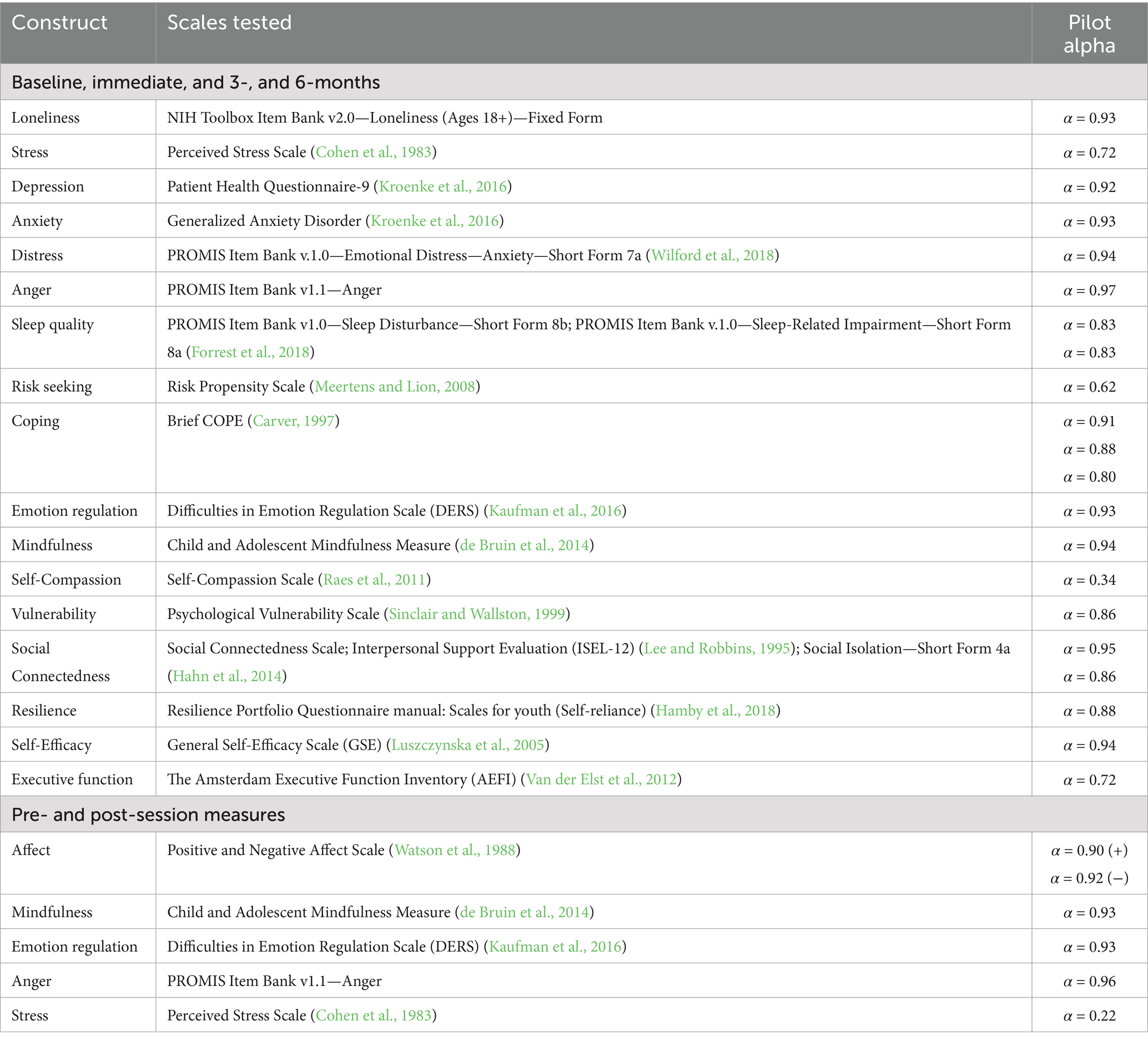 To assess the reliability of outcome measures in the baseline and follow-up surveys, Cronbach alpha scores were calculated for all scales and ranged from α = 0.34–0.97 (Table 6). All outcomes were deemed to have acceptable reliability except self-compassion and risk-seeking measures. To assess the reliability of outcome measures in the pre-and post-session surveys, Cronbach alpha scores were calculated for all scales and ranged from α = 0.22–0.96. All outcomes were deemed to have acceptable reliability except the abbreviated stress scale. There were no adverse events or protocol deviations during this study.