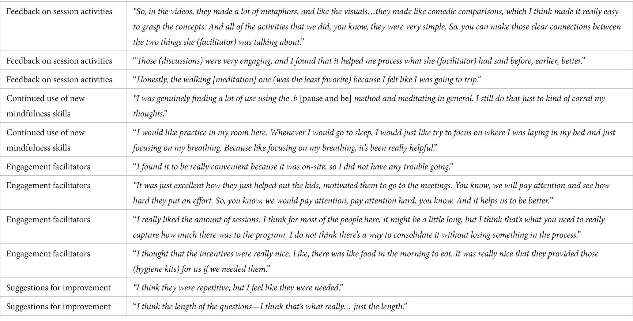 Overall, the youth described the usefulness of .b4me and how it helped them with emotion regulation, mindfulness, and coping. Based on the responses in the exit interviews, youth felt that the sessions had benefitted them in many ways. “Well, it’s very interesting. It helped me cope with a lot of things.” Several participants spoke about how the mindfulness practices learned in the intervention helped to clear their minds. One participant mentioned regaining control over their thoughts and said, “Honestly, it was kind of eye-opening to the fact that my brain could work a certain way, and I could learn to tame it.” Another participant described the intervention as “learning to help your brain stop, going back into that primal mode that it was set in for years.” One youth felt that there were also other potential benefits for others. They said, “I feel like people with anxiety disorder could benefit too, just learning how to, like, get a hold on their brain.” When asked the purpose of the study, one participant believed that it was “to spread awareness of your brain and how it works and how to fix what has been wired into it.” In general, the study sessions seemed to be positively received. As stated by one of the participants, “It helped me out throughout the whole session,… before I even got into the sessions and stuff, I just felt angry most of the time. You know, it helped me learn new skills, how to cope with it, and…better myself.” Additional themes are summarized in Table 7.