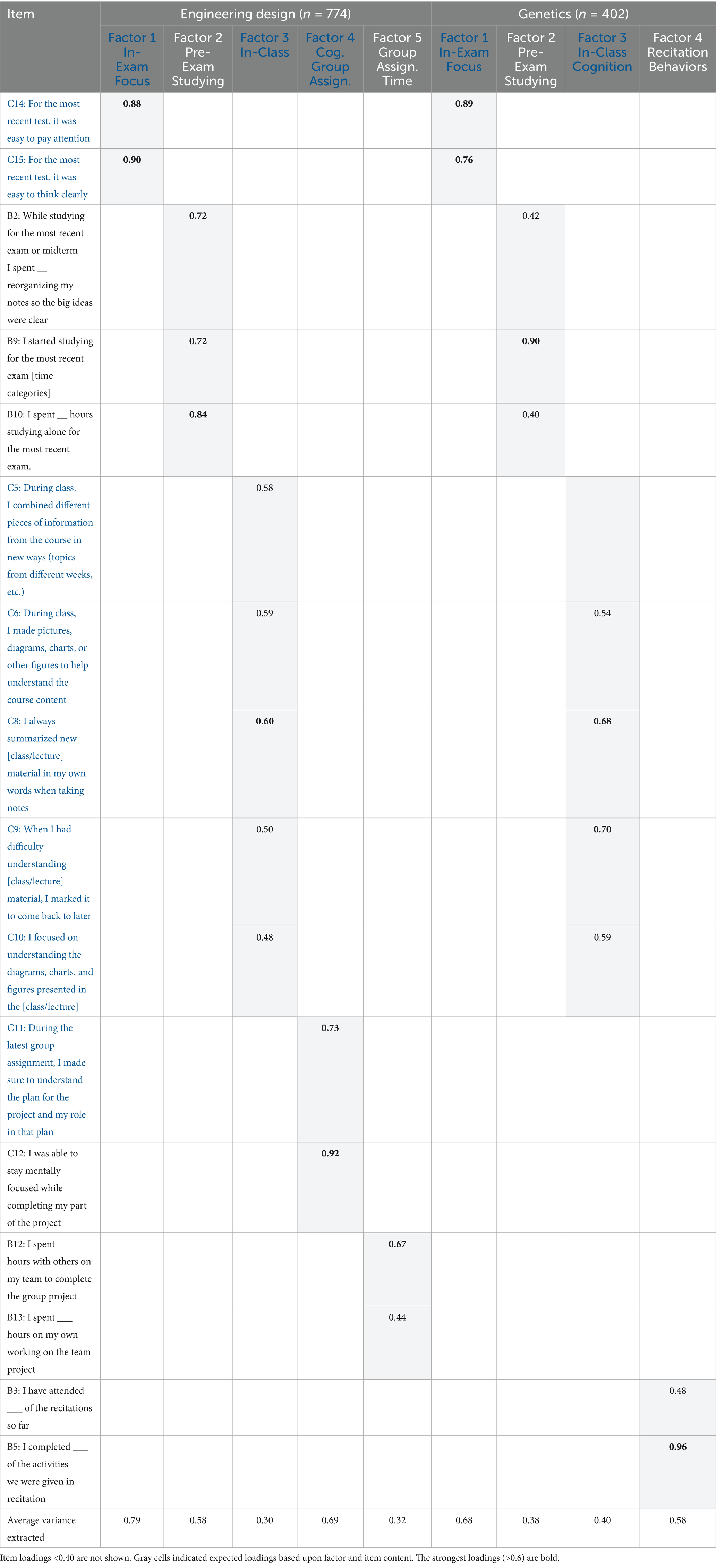 In contrast to the expectations of prevailing theory, the data did not break down into a two-factor solution composed of (1) behavioral and (2) cognitive engagement. Instead, a five-factor solution emerged for engineering, consisting of (1) in-exam cognitive focus, (2) in-class cognitive strategies, (3) cognitive engagement with group assignments, (4) pre-exam studying behaviors, and (5) time spent on group assignments. An identical four-factor solution emerged for genetics except for the absence of the two group assignment factors (group assignments were not part of the course) and the addition of a behavioral factor for attending and completing activities in recitations (the engineering course did not have recitations). The maximum inter-factor correlation was 0.44 for engineering and 0.30 for genetics, indicating acceptable factor separation. Rotated factor loadings are in Table 1 with replication studies confirming the factor structure (Appendix B).
