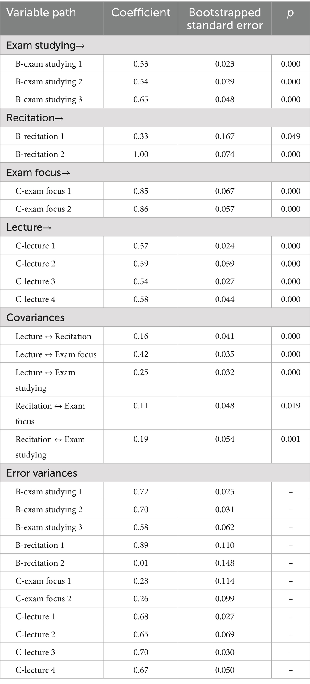 Data were assessed for CFA suitability. While no variable exceeded |2| skewness or 7 kurtosis, formal skewness and kurtosis tests, Shapiro–Wilk tests (Appendix Tables A8, A9), and the Doornik-Hansen test of multivariate normality ( = 3058.2, p < 0.001) indicated several non-normal distributions necessitating nonparametric estimation (e.g., bootstrapping) (Brown, 2015; Flora and Flake, 2017). CFA was conducted using maximum likelihood estimation with 5,000 bootstrapped standard error iterations with resampling at the course section level to control for data clustering. Analysis took place in Stata v.18 using the sem package.