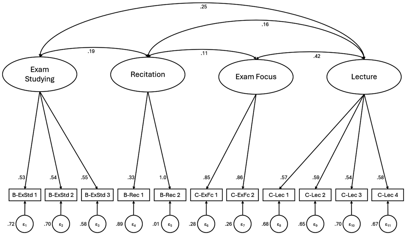 Two hypothesized structures were tested. The first was the traditional behavioral-cognitive structure with all five behavioral items loading on the single latent behavioral factor and all six cognitive items loading on the cognitive factor. The second model tested the EFA-derived emergent structure based on spaces of engagement. Four spaces were hypothesized: pre-exam studying behavior (three items), recitation behavior (two items), in-exam focus cognition (two items), and lecture cognition (four items).