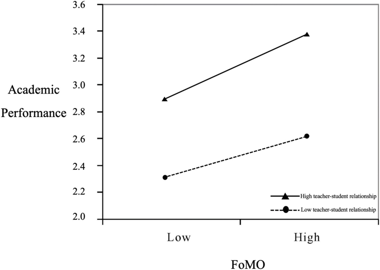 Figure 2. Moderating effects of teacher-student relationship quality on the association between fear of missing out and academic performance.
