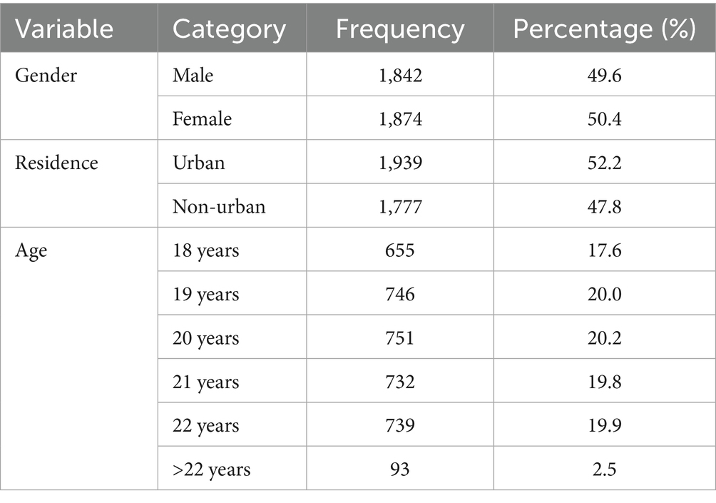 The final sample comprised 1,842 males (49.6%) and 1,874 females (50.4%), with 1,939 urban residents (52.2%) and 1,777 rural residents (47.8%). Age distribution included 655 eighteen-year-olds (17.6%), 746 nineteen-year-olds (20.0%), 751 twenty-year-olds (20.2%), 732 twenty-one-year-olds (19.8%), 739 twenty-two-year-olds (19.9%), and 93 participants over twenty-two years (2.5%), as detailed in Table 1.