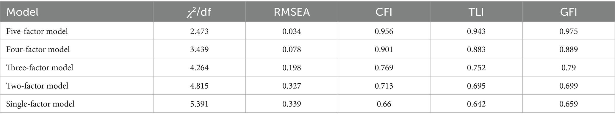 This study utilized AMOS 26.0 statistical software to conduct confirmatory factor analysis on five core latent variables, with model fit indices detailed in Table 2. The analysis demonstrated that the five-factor model achieved a chi-square to degrees of freedom ratio (χ2/df) of 2.473 (below the critical value of 3), a root mean square error of approximation (RMSEA) of 0.034 (below the threshold of 0.08), and comparative fit index (CFI), Tucker-Lewis index (TLI), and goodness of fit index (GFI) values all exceeding 0.90. These fit indices not only fully satisfy statistical requirements but also demonstrate superior fit compared to alternative competing models, indicating robust discriminant validity in this study.