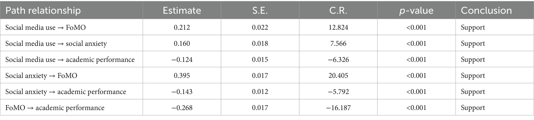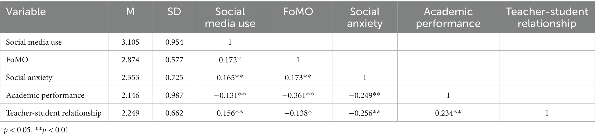 Results: Social media use had a significant negative direct effect on college students’ academic performance. Social anxiety and FoMO served as significant mediators in this relationship. Teacher-student relationships significantly moderated the negative effect of FoMO on academic performance.