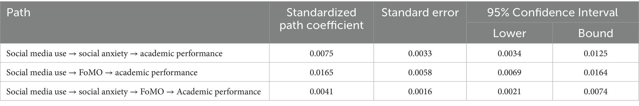 Based on the research’s conceptual model, this study hypothesized that social anxiety and fear of missing out would mediate the relationship between adolescent social media usage and academic performance, with analysis and verification conducted using AMOS 28.0. The bias-corrected nonparametric percentile bootstrap method was employed to examine the mediation effects of social anxiety and fear of missing out. Table 5 presents standardized estimates for each indirect path and 95% confidence intervals for mediation effects, with mediation effects considered significant when 95% confidence intervals exclude zero. According to Table 5, the 95% confidence intervals for all three indirect paths exclude zero, indicating significant effects for social anxiety mediation, fear of missing out mediation, and serial mediation. Specifically, the mediation effect value for social anxiety was 0.0075, for fear of missing out was 0.0165, and for serial mediation was 0.0041. Therefore, Hypotheses 2, 3, and 4 are all supported.