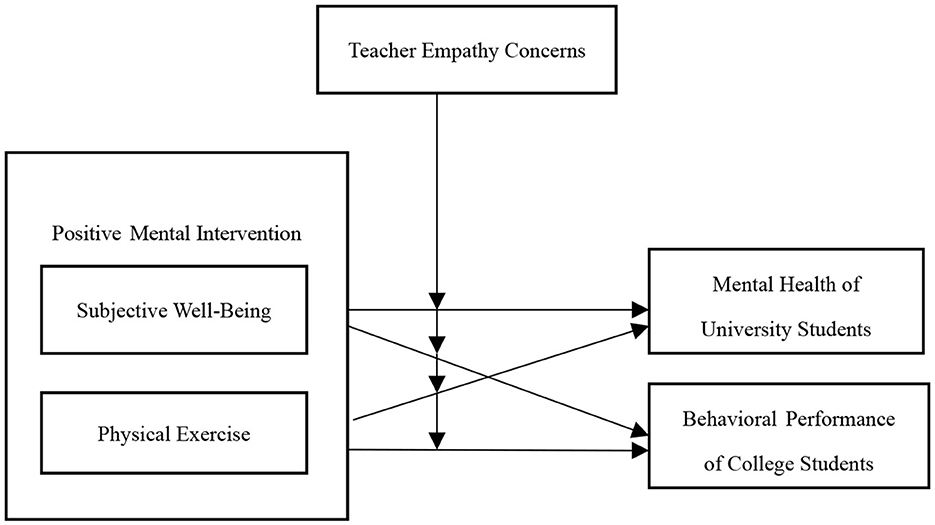 Figure 1. A Conceptual model of the relationship between positive mental interventions, subjective wellbeing, physical exercise, teacher empathic concerns, and college students' mental health and behavioral performance.