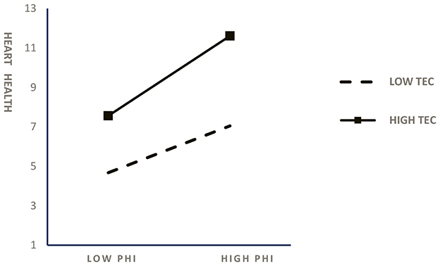 Figure 2. Moderating effects of teacher empathetic concerns on the link between positive heart interventions and college students' mental health.