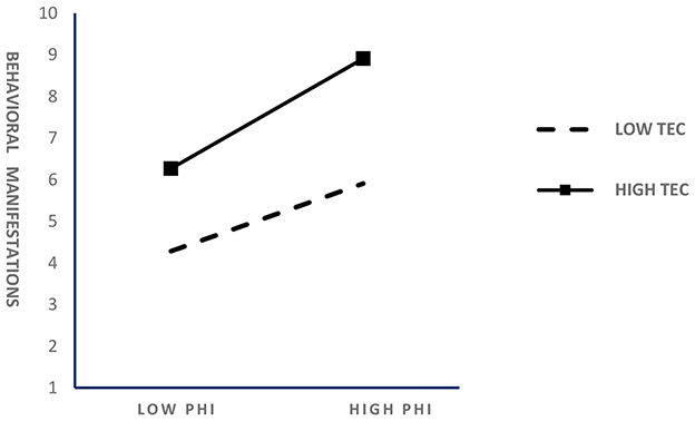 Figure 3. Moderating effect of teacher empathic concerns on the relationship between positive heart intervention and college students' behavioral performance.