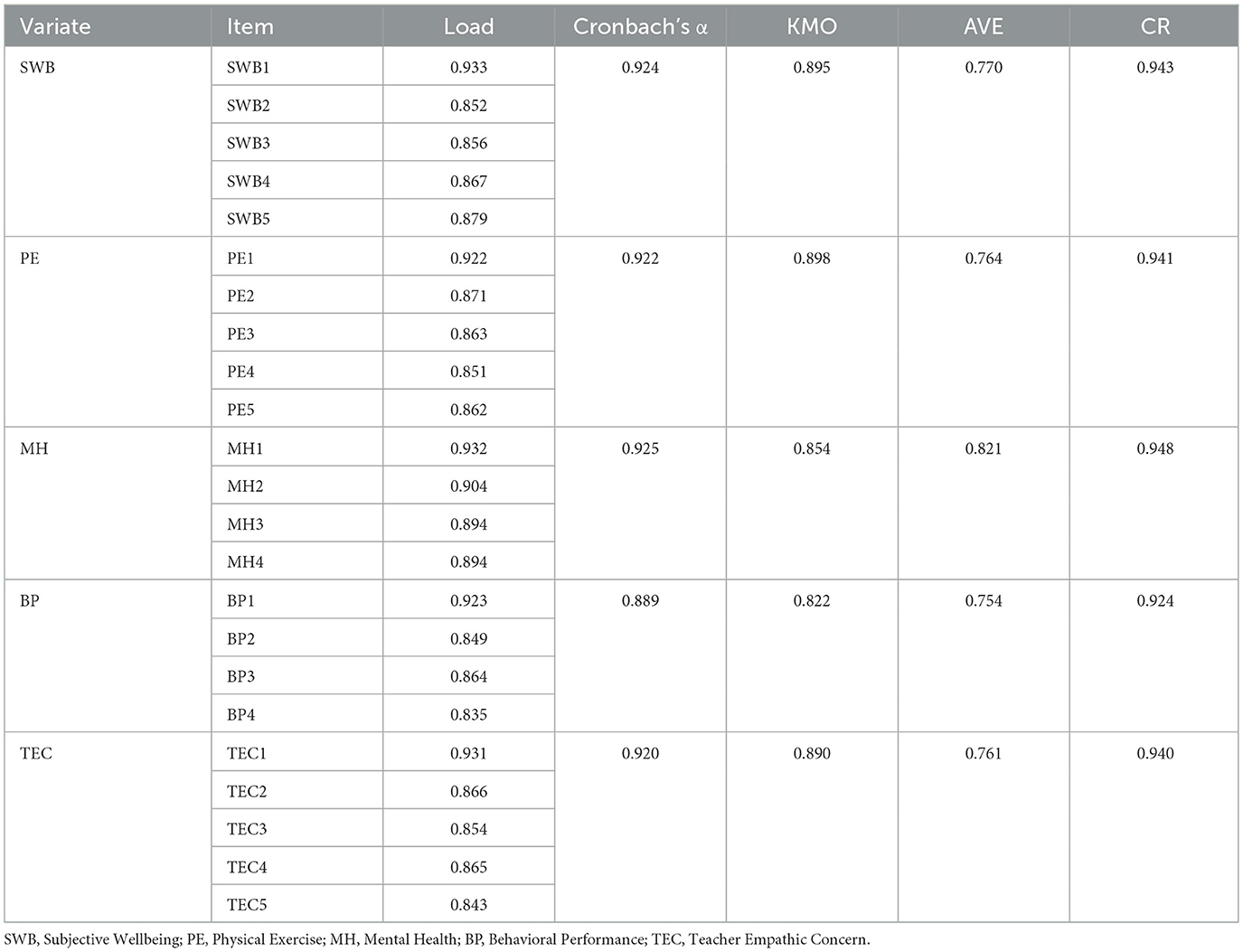With a view to test the reliability and validity of the interview schedule, this paper used the statistical software SPSS27.0 to assessment the reliability and validity of the variables of subjective wellbeing, physical exercise, teacher empathy concern, college students' mental health and behavioral performance in order to validate the relationship between each variable. As can be seen in Table 1, the Cronbach's α coefficients of each research variable ranged from 0.889 to 0.925, the KMO values of the variables were distributed from 0.822 to 0.898, and the combined reliability (CR) ranged from 0.924 to 0.948, with the respective values higher than 0.7, which indicates that the variables have a high reliability condition. The factor loadings of each variable ranged from 0.835 to 0.933, reaching values higher than 0.5, which proves that the scale validity of the research variables is good. The AVE of each research variable ranged from 0.754 to 0.821, meeting the critical value higher than 0.5, indicating a good discriminant validity of respective research variable.