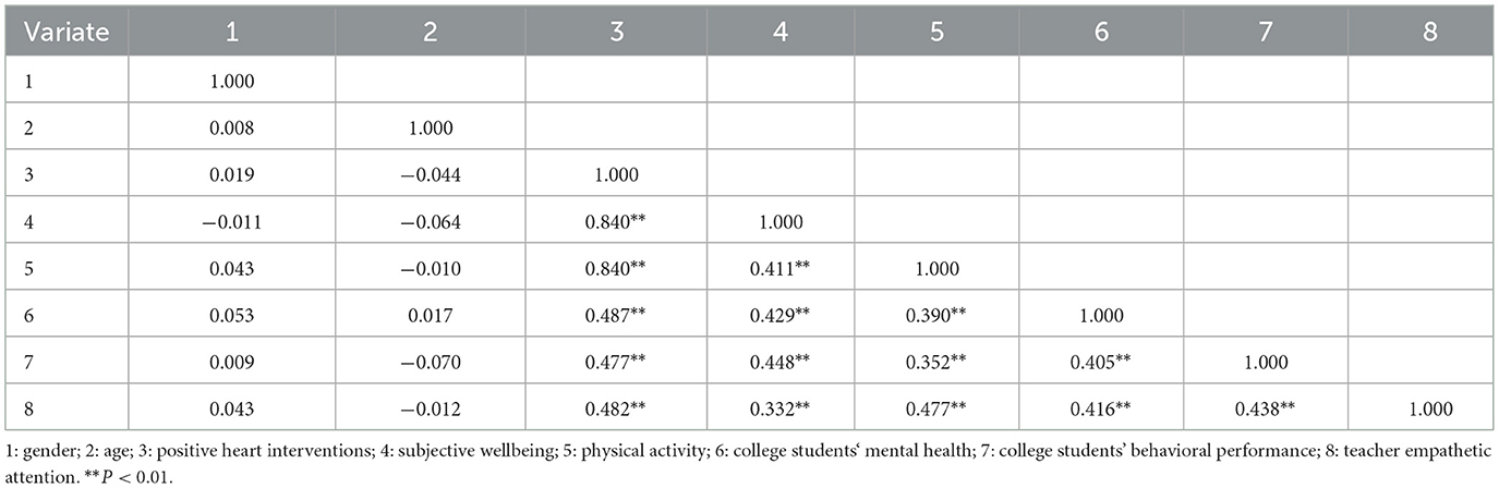Results: The results of the study showed that positive heart interventions, subjective wellbeing, and physical activity had a significant role in promoting college students' mental health and behavioral performance, positive heart interventions (β = 0.488, P < 0.001), (β = 0.474, P < 0.001) subjective wellbeing (β = 0.327, P < 0.001), (β = 0.362, P < 0.001), and physical activity (β = 0.254, P < 0.001), (β = 0.203, P < 0.001). In addition, teachers' empathetic attention played a positive moderating role between positive heart interventions and college students' mental health (β = 0.332, P < 0.001). Teachers' empathic concern played a positive moderating role between positive heart intervention and college students' behavioral performance (β = 0.223, P < 0.001).