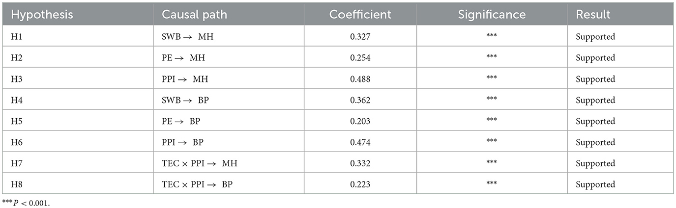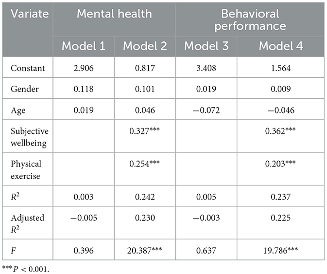 For the relative reliability of the research conclusions, SPSS27.0 software was used to process the data for each variable as a means to preliminarily verify the research hypotheses of each variable. As demonstrated in Table 2, the regression coefficients of subjective wellbeing on university students' mental health and behavioral performance are (β = 0.429, P < 0.01) and (β = 0.448, P < 0.01), the regression coefficients of physical exercise on college students' mental health and behavioral performance are (β = 0.390, P < 0.01) and (β = 0.352, P < 0.01), and the regression coefficients of positive heart intervention on college students' The regression coefficients of mental health and behavioral performance were (β = 0.487, P < 0.01) and (β = 0.477, P < 0.01), respectively, and the above correlation coefficients were significant, which preliminarily verified the hypotheses put forward in this study.