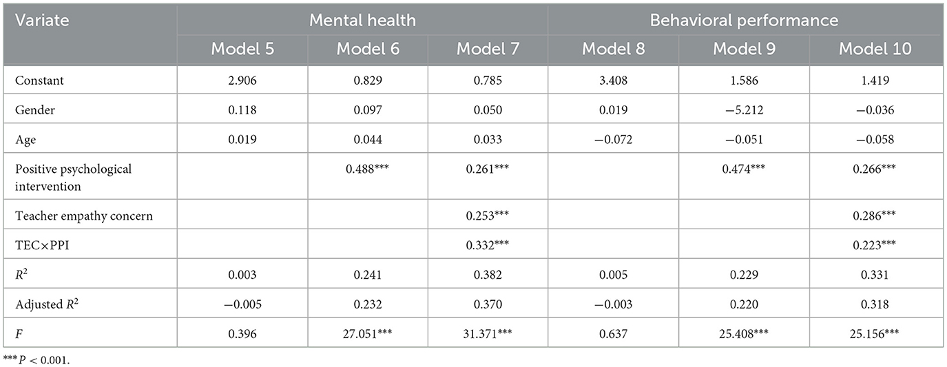 Table 5. Regression analysis of positive psychological intervention, teacher empathic concern and college students' mental health and behavioral performance.