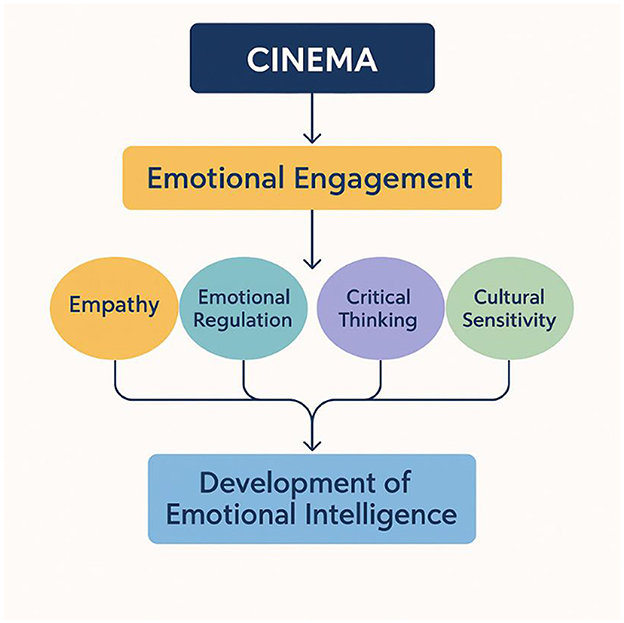 5. Memory and engagement: content with an emotional appeal boosts retention and mental engagement, which is consistent with the findings from affective neuroscience correlating emotional arousal with enhanced memory encoding (Antonopoulou and Halkiopoulos, 2024). As depicted in the conceptual flowchart (Figure 1), cinematic engagement serves as a catalyst for developing emotional intelligence by fostering empathy, strengthening emotional regulation, promoting critical thinking, and nurturing cultural sensitivity.