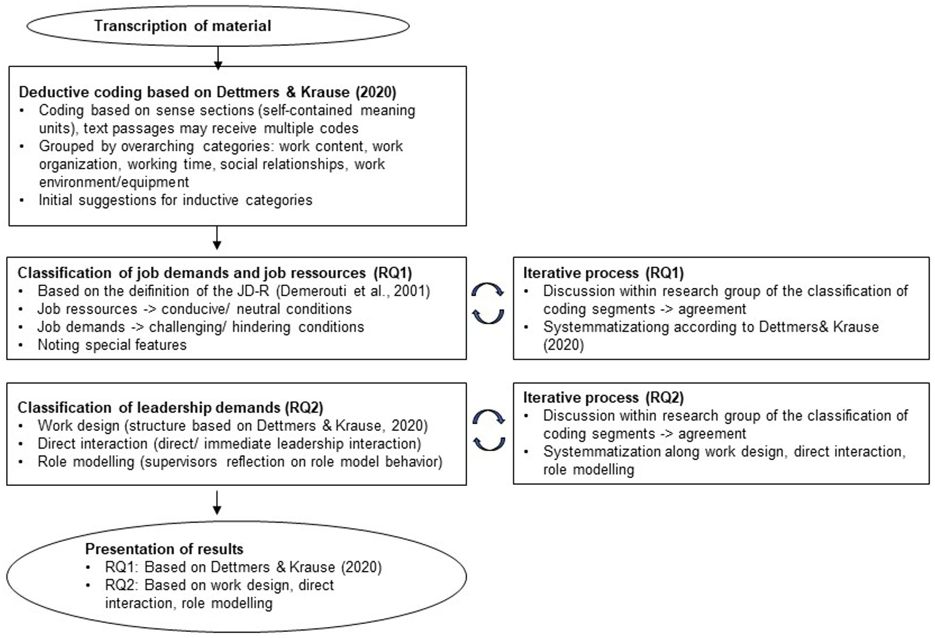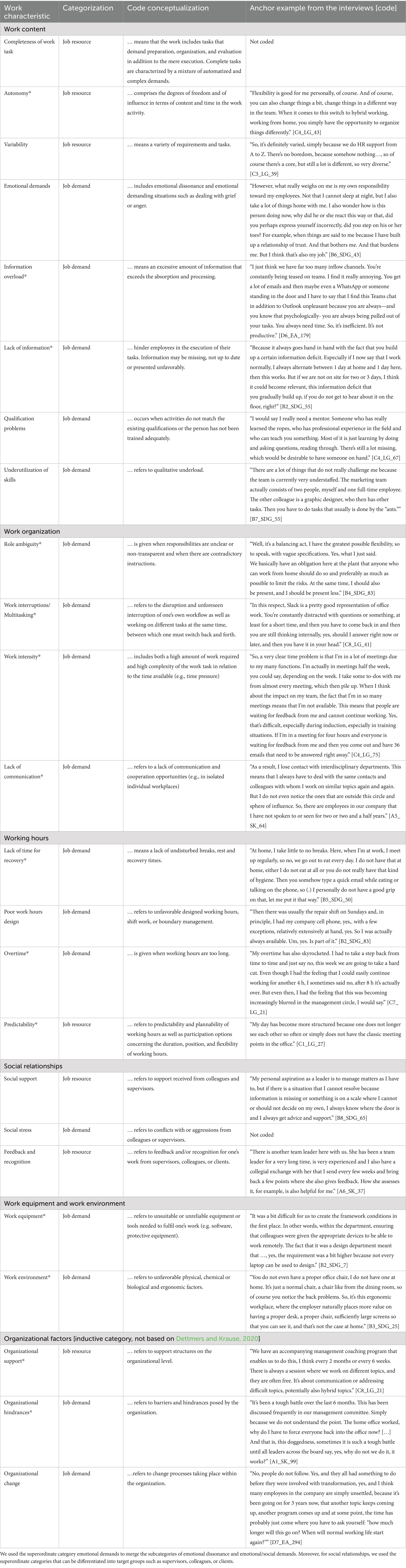 The transcribed material was coded by the author and the research assistants (see Appendix C for the original quotations in German and their English translations). They coded the material based on sense sections (passages that form a self-contained meaning), whereby text passages could be assigned several codes. In the initial review of the study material, we coded work characteristics based on the deductive categories provided by Dettmers and Krause (2020) and Table 1 for conceptualization and anchor examples. Additionally, it was possible to derive and suggest initial inductive categories based on the material not covered by the classification of work characteristics by Dettmers and Krause (2020) and Figure 1.