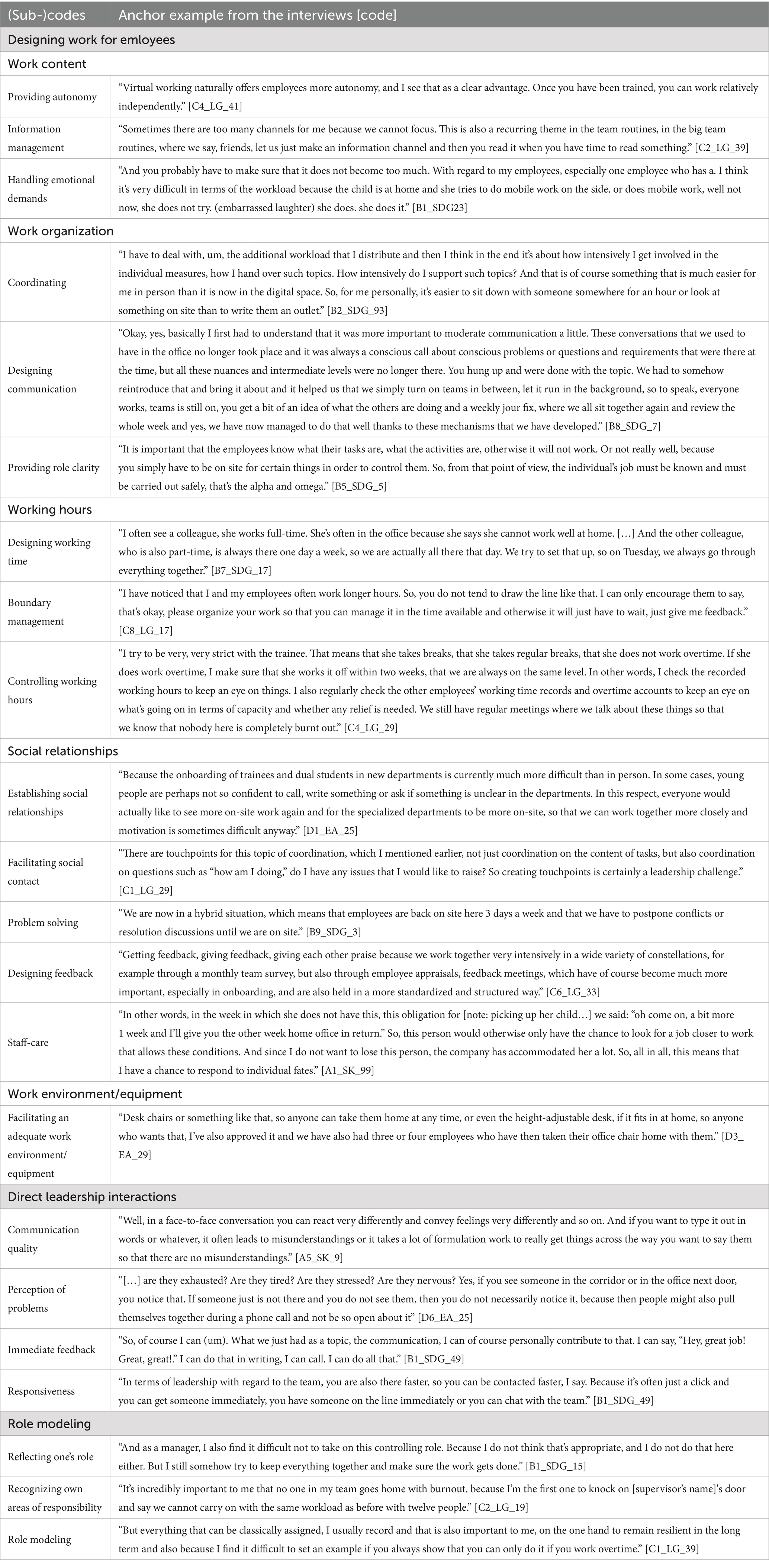 The structure of the interview guidelines (see Appendix B for supplementary materials) was based on general recommendations for work characteristics, including psychosocial risk assessment (Dettmers and Krause, 2020; World Health Organization, 2022). The first part of the guidelines ensured a standardized introduction of the topic, terminology, and the proceedings. Additionally, demographic (age, gender) and organizational background variables (industry, tenure of supervisor in current position, overall tenure leadership, number of employees supervised) were collected before the audio recording started. The following part addressed general questions about the perceptions of the hybrid work situation, which was often linked to the circumstances of the (post-)pandemic situation due to the timing of the interviews.