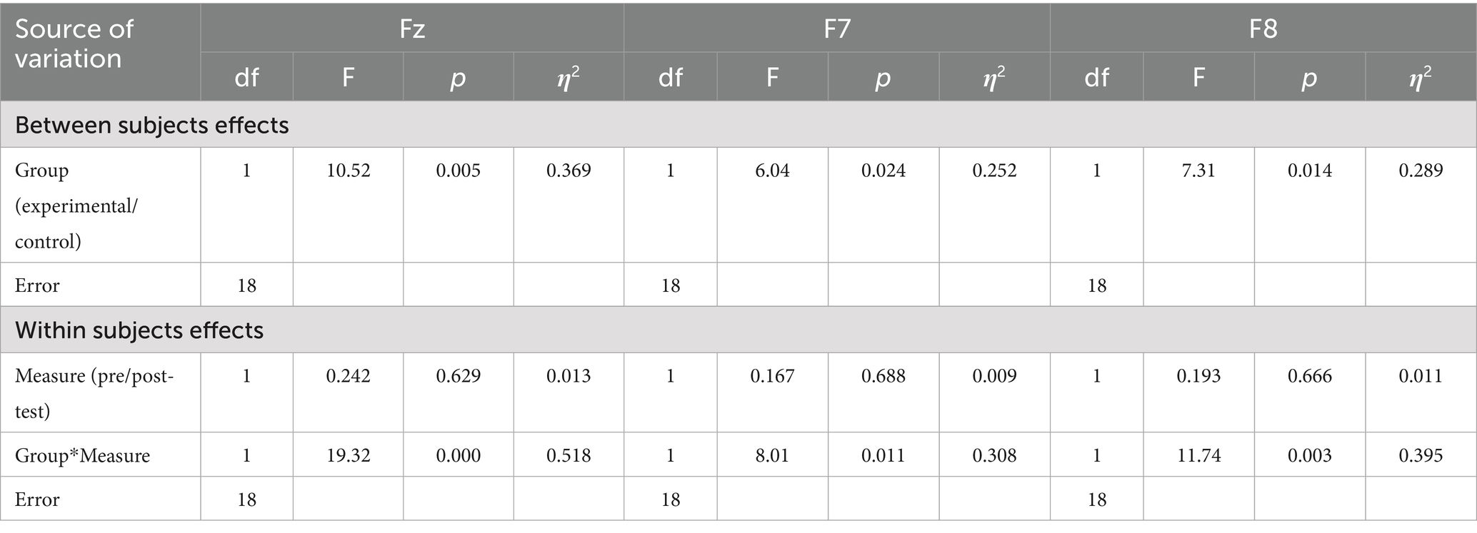 As shown in Table 2, it can be said that there was a significant difference between the pre-test and post-test scores in the frontal theta/beta power ratios of the athletes who participated in the experimental and control groups after the kids yoga applications, in other words, it can be said that the procedures applied in different groups created significant differences in the Fz, F7 and F8 electrode regions. In the Fz electrode region: Wilks’ λ: 0.987, F(1,18) = 19.32, p < 0.05, the significant difference seen (η2 = 0.518) has a large effect size; In the F7 electrode region: Wilks’ λ: 0.692, F(1,18) = 8.01, p < 0.05, the significant difference seen (η2 = 0.308) has a large effect size; In the F8 electrode region: Wilks’ λ: 0.605, F(1,18) = 11.74, p < 0.05, the significant difference seen (η2 = 0.395) has a large effect size. This finding shows that the kids yoga practice has an effect on the participants’ frontal theta/beta power ratios. In order to determine the source of the significant difference between the groups, the “Bonferonni compatible multiple comparisons” test was applied (Table 4). Furthermore, in order to control the potential Type I error risk arising from multiple comparisons regarding the significance of the group*measurement interaction, the Holm-Bonferroni correction was applied. Within the scope of this correction, the p-values were ranked in ascending order (Fz = 0.000, F8 = 0.003, F7 = 0.011) and each was compared with its corresponding threshold value calculated according to the Holm-Bonferroni method (Fz: 0.05 / 3 = 0.0167; F8: 0.05 / 2 = 0.025; F7: 0.05 / 1 = 0.05). As a result of these comparisons, all three p-values were found to be below their respective thresholds (Fz = 0.000 < 0.0167; F8 = 0.003 < 0.025; F7 = 0.011 < 0.05), and thus remained statistically significant after correction. These findings indicate that the changes observed over time in the EEG measurements of the experimental group (at Fz, F7, and F8 sites) were statistically significant compared to the control group. In other words, it can be concluded that the experimental intervention led to statistically significant and re-liable effects on EEG activity.