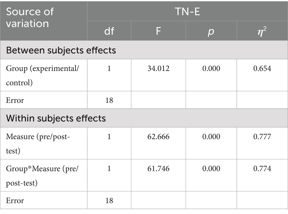 As shown in Table 3, it is seen that there is a significant difference (Wilks’ λ: 0.226, F(1,18) = 61.74, p < 0.05) between the pre-test and post-test scores of the d2 attention test TN-E value of the athletes participating in the experimental and control groups after the kids yoga practices. When we examine the common effect created by the groups and measurements, it can be said that different applications made on the groups create a difference in TN-E values and the eta squared statistic value of this common effect (η2 = 0.774) has a strong effect size. In order to determine the source of the significant difference between the groups, the “Bonferonni compatible multiple comparisons” test was applied (Table 4).