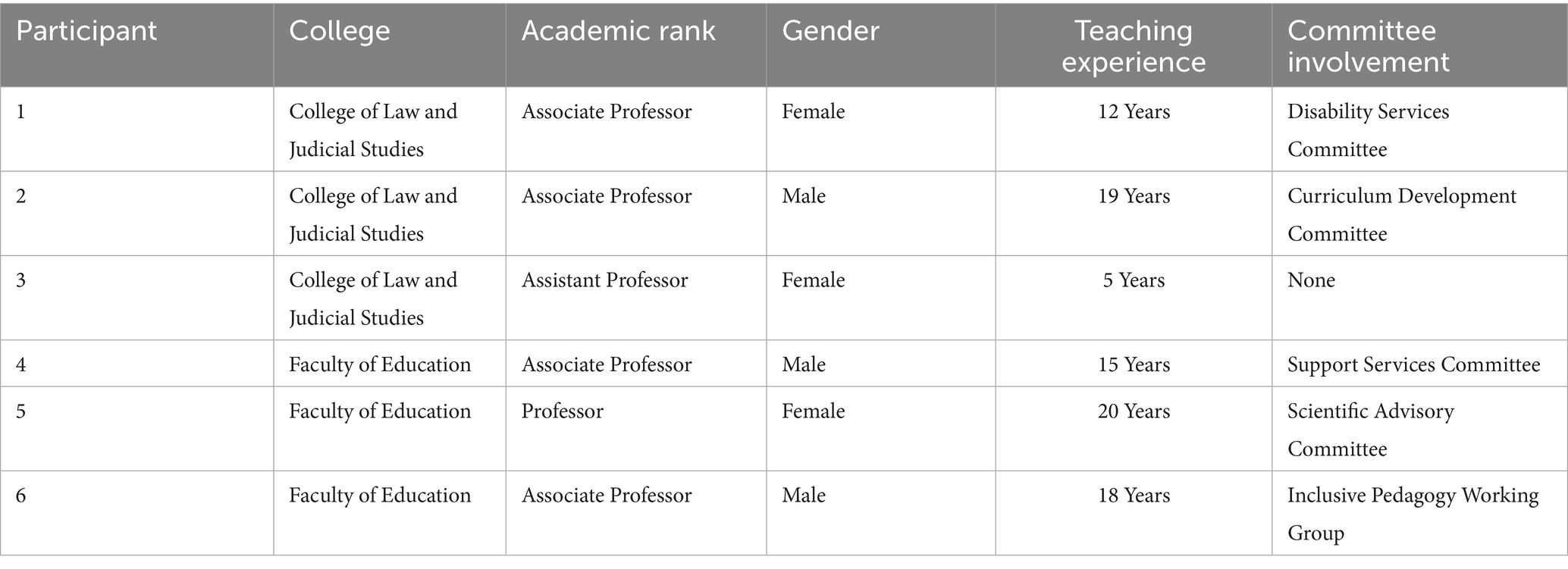 The study sample comprised six faculty members selected via purposive sampling to ensure rich, relevant insights into teaching visually impaired students. They taught students with visual impairment. Participants were drawn from two distinct colleges (Law and Judicial Studies; Education) and spanned a range of academic ranks (Assistant to Full Professor). Purposive sampling targeted those with direct experience in inclusive pedagogy and familiarity with institutional support mechanisms, thereby maximizing data relevance. Including multiple disciplines and ranks allowed examination of how accessibility challenges differ by teaching context and level of institutional authority. A cohort of six aligns with established phenomenological guidelines recommending five to ten participants to reach thematic saturation without sacrificing depth. This size provided sufficient diversity to capture varied perspectives while permitting the sustained, iterative coding, member checking, and in-depth interviews necessary to produce nuanced, trustworthy findings suitable for rigorous academic publication. Table 1 showcases the demographic characteristics of the sample.