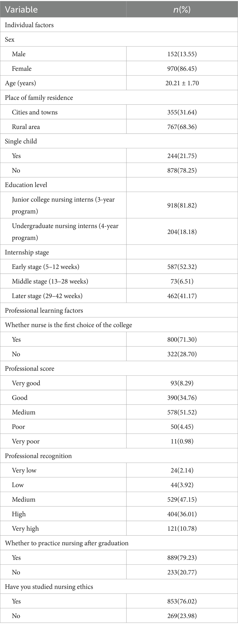 The anonymous questionnaire survey was carried out online through the “Questionnaire Star” platform1, relying on WeChat (the largest Chinese social media platform). The class counselors of the nursing schools sent the electronic questionnaire QR Code generated by “Questionnaire Star” to the Wechat Group where the clinical practice nursing interns were located, and explained the informed consent and exclusion criteria uniformly, which were filled out by the voluntary scanning QR Code of nursing interns. The questionnaire was administered in Chinese with uniform instructions to explain the purpose, significance and filling method of this survey. To ensure data quality, the following validation protocols were implemented via Questionnaire Star: Single submission per WeChat ID to prevent duplicates, submission permitted only after all required items were answered and responses with completion time <3 min were invalidated. Study data accessed via Questionnaire Star’s secure login credentials were downloaded in Excel format and encrypted to ensure participant privacy. A total of 1,164 questionnaires were collected, and 42 including same score and across all items were eliminated. Finally 1,122 questionnaires were suitable for analysis after data cleaning, with an effective recovery rate of 96.39%.