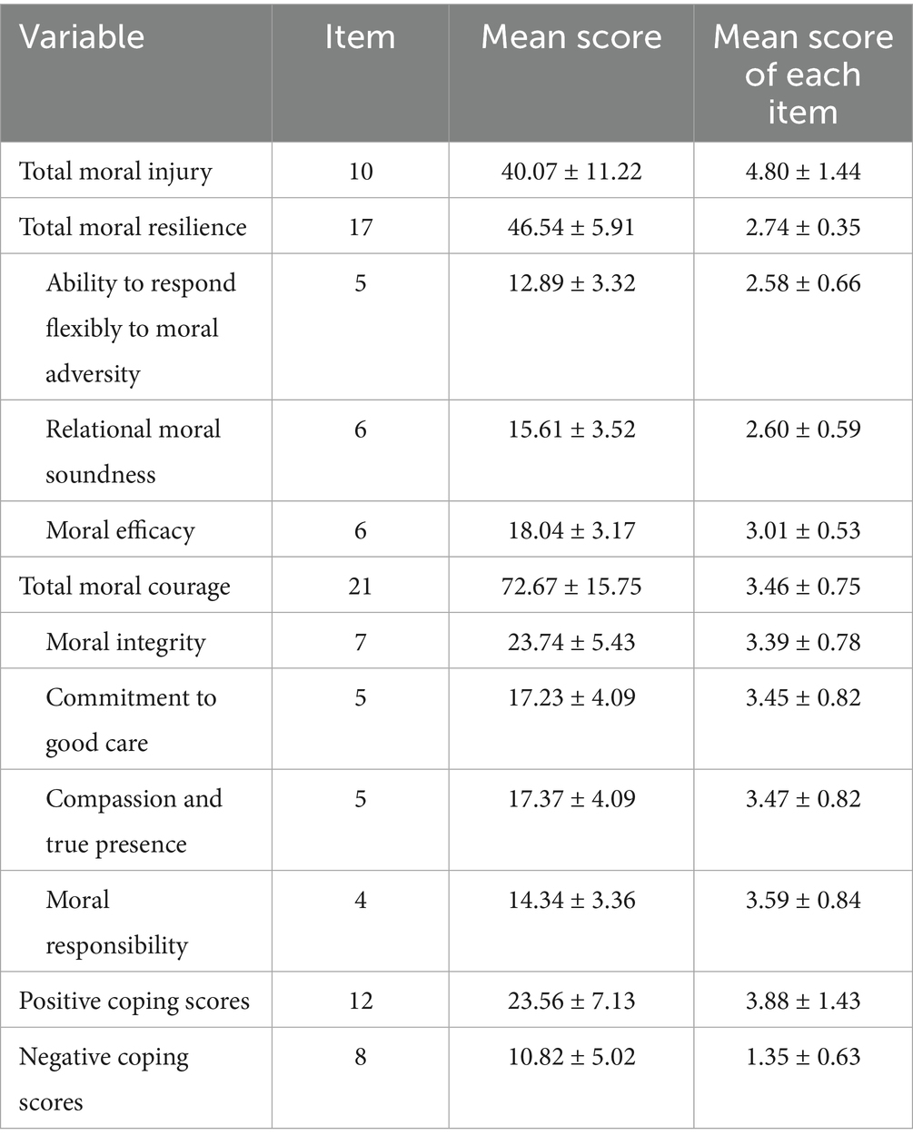 For healthcare professionals, the positive coping styles employed to address moral injury are also rooted in moral resilience. Certain coping styles can be reinforced through the cultivation of moral resilience (Faraco et al., 2022). Furthermore, research has indicated that moral resilience can strengthen the connection between self-coping styles and positive emotions, enabling nurses to approach ethical challenges more constructively and proactively, such as moral dilemmas or moral injury (Hossain and Clatty, 2021; Lathabhavan et al., 2023).