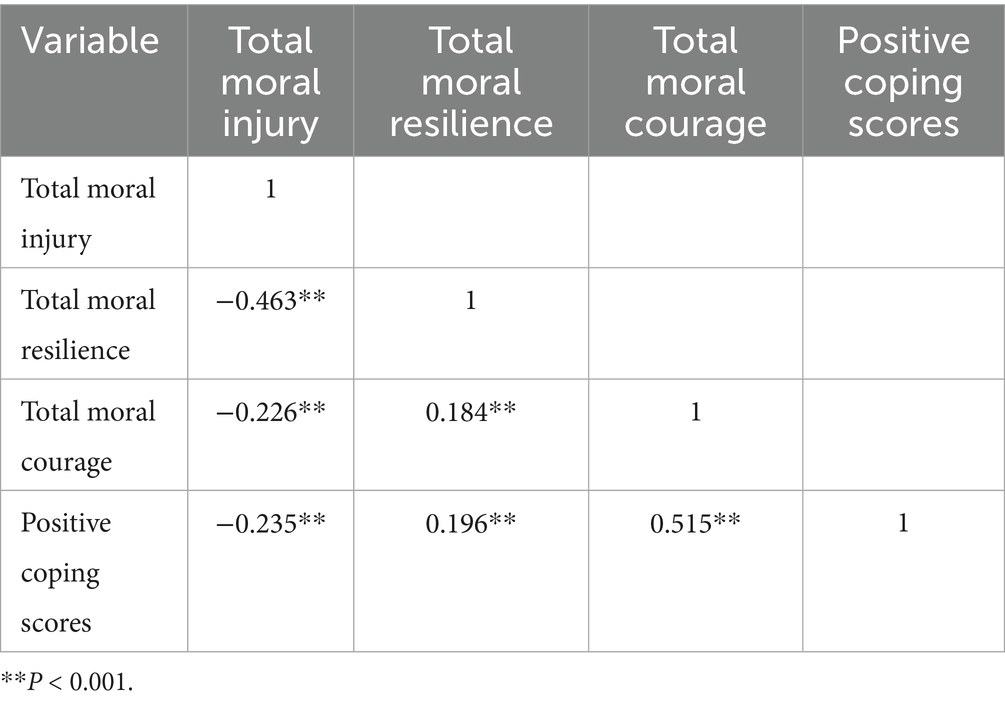 The correlation matrix depicted that moral injury was negatively associated with moral resilience (r = −0.463, P < 0.001), moral courage (r = −0.226, P < 0.001) and positive coping scores (r = −0.235, P < 0.001). Moral resilience was positively correlated to moral courage (r = 0.184, P < 0.001) and positive coping scores (r = 0.196, P < 0.001). Additionally, moral courage was positively associated with positive coping scores (r = 0.515, P < 0.001) (Table 3).