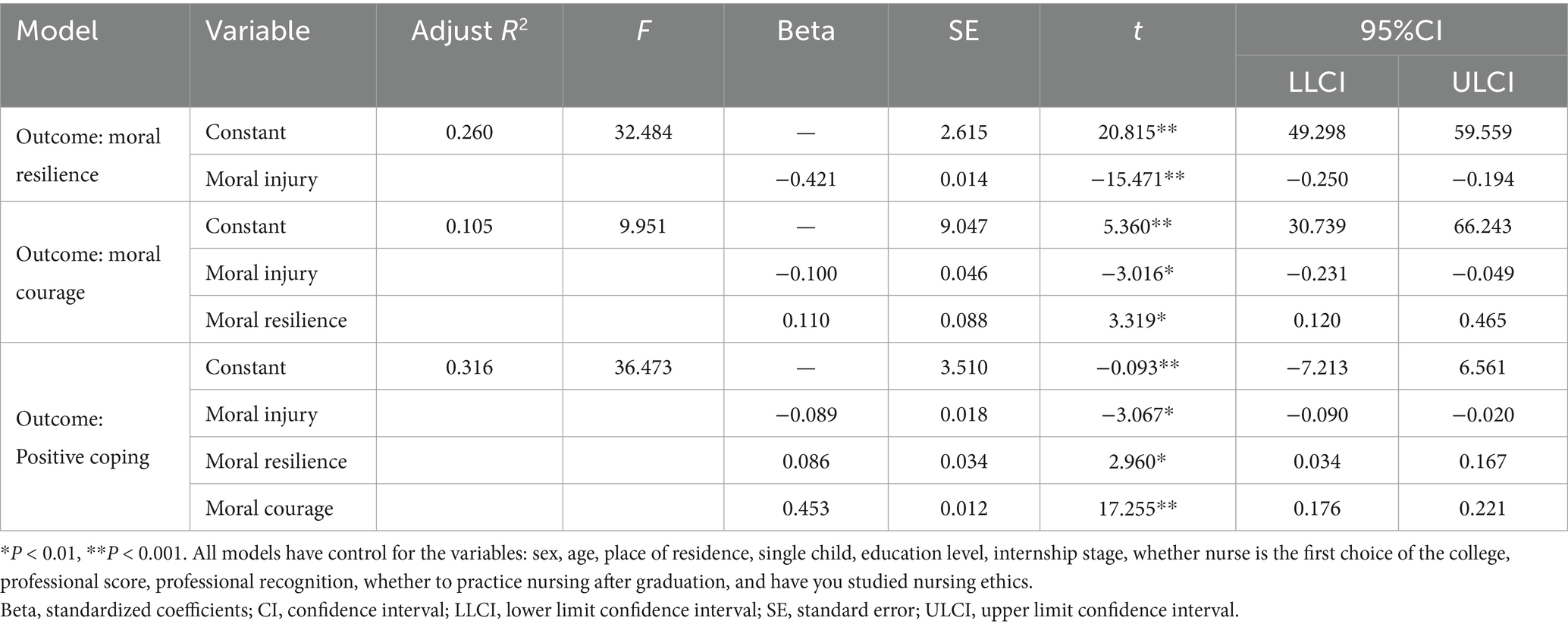 The results indicated a significant negative correlation between moral injury and each of moral resilience, moral courage, and positive coping, thereby supporting Hypotheses 1 and 2. Additionally, moral resilience and moral courage were significantly positively correlated with positive coping, supporting Hypothesis 3. After adding covariates, moral resilience and moral courage significantly moderated the influence of moral injury on positive coping. Furthermore, moral resilience directly influenced moral courage, supporting Hypothesis 4.