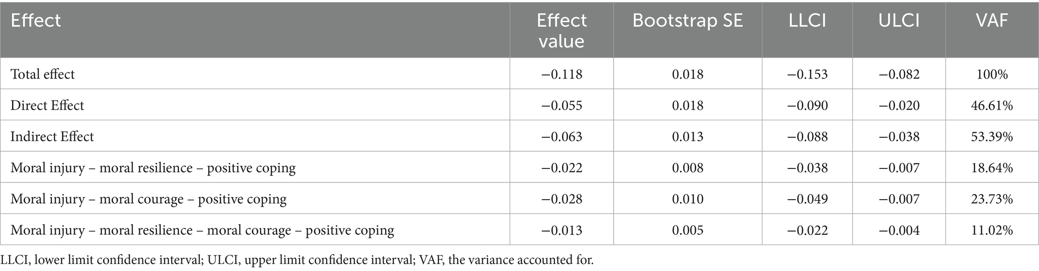 Using the Bootstrap method with 5,000 resamples, we calculated 95% confidence intervals for the model’s total effect, direct effect, and indirect effect. The 95% confidence intervals for each effect did not contain zero, indicating that moral resilience and moral courage each served as mediators between moral injury and positive coping (with effect sizes of 0.022 and 0.028, respectively) and functioned as a sequential mediator (effect size 0.013). The total effect of moral injury on coping styles 0.118, with a direct effect of 0.055 and an indirect effect of 0.063. The mediating effect of moral resilience and moral courage accounted for 53.39% of the total effect, as shown in Table 5.