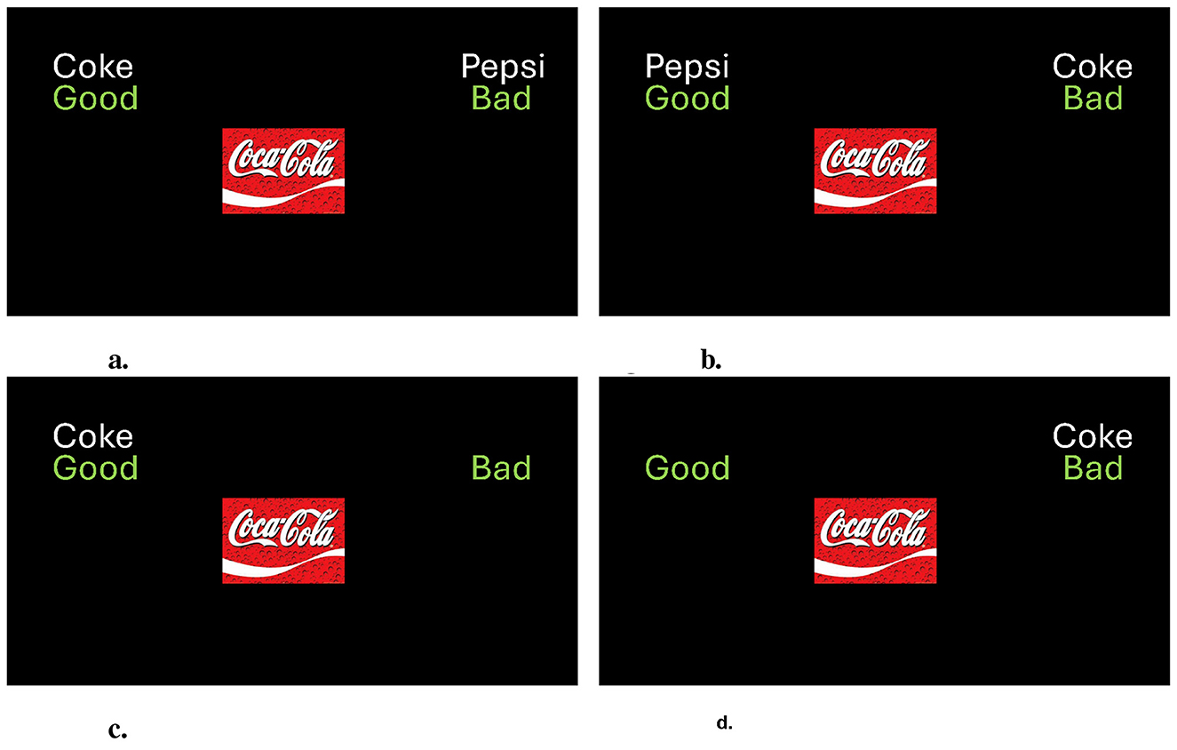 Figure 1. Associative conditions: (a) Coke-Good/Pepsi-Bad condition of a Soda IAT, (b) Coke-Bad/Pepsi-Good condition of a Soda IAT, (c) Coke-Good condition of a Coke SC-IAT, and (d) Coke-Bad condition of a Coke SC-IAT.
