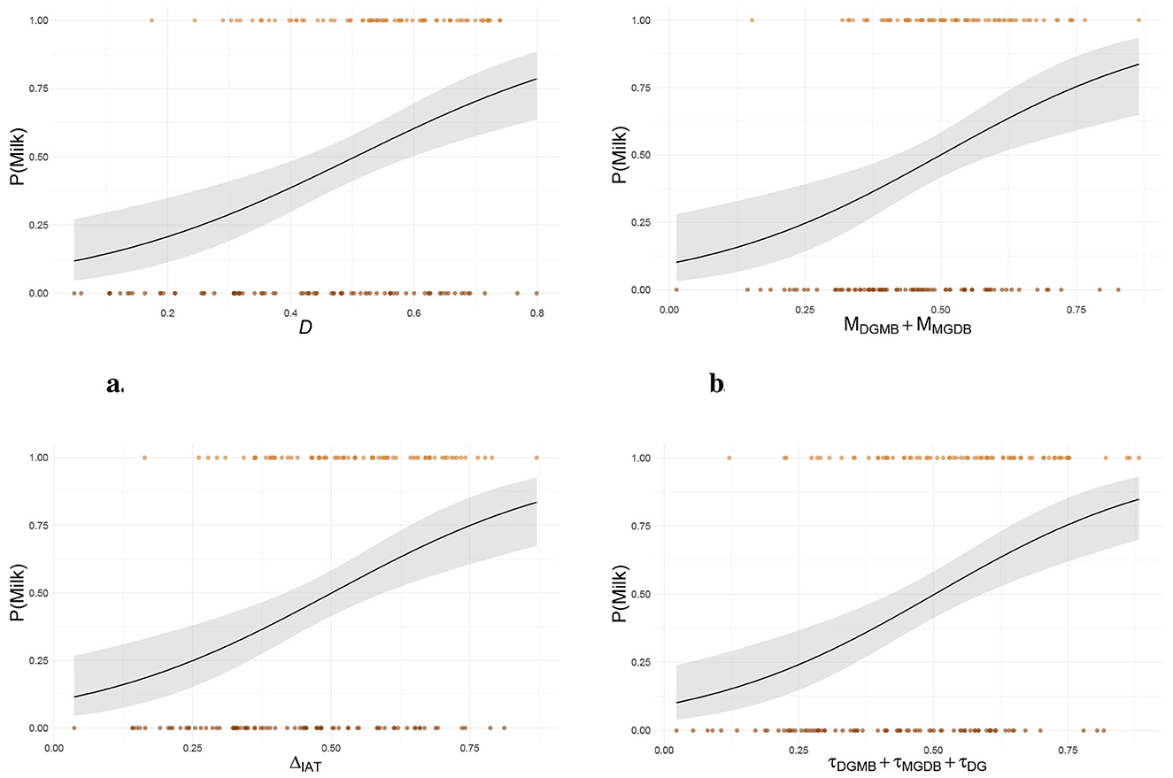 At the end of the experiment, the 48% of the respondents chose the milk chocolate bar. In the original study, participants were unaware of the availability of a chocolate bar during the experiment, as it was presented only at the very end, after all experimental procedures had been completed, as a token of participation. The chocolate bar was offered to all participants. Results of the models obtained with stepwise logistic regressions are illustrated in Figure 2.