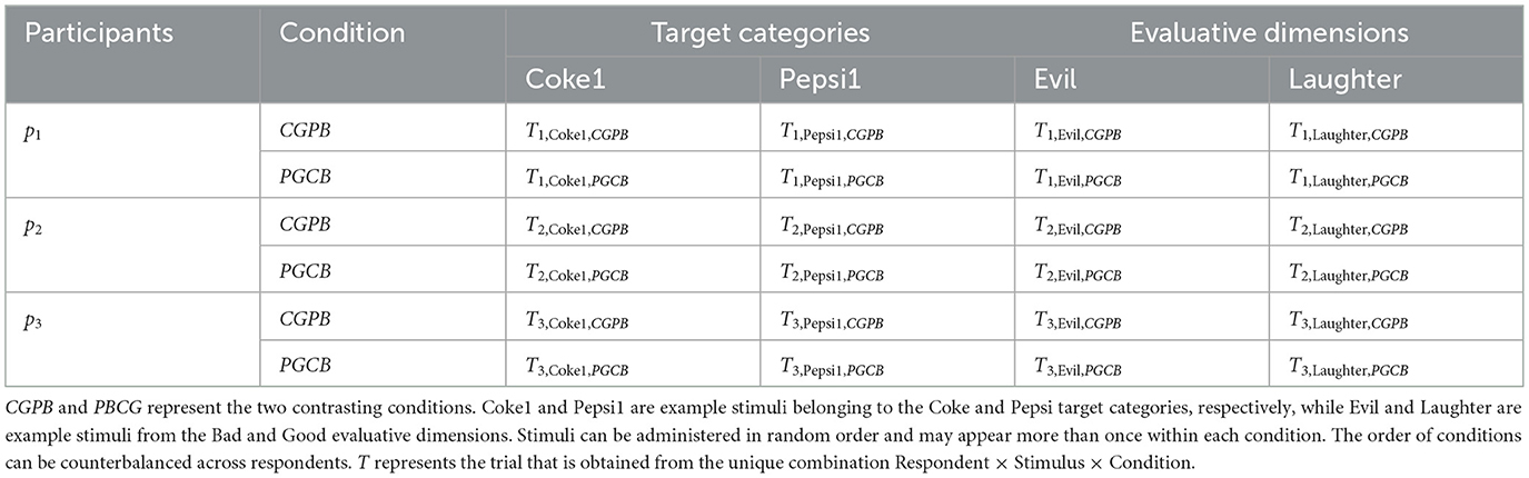 In a multilevel modeling perspective, the contrasting conditions (CGPB and PBCG) are at the highest level, including both respondents (p1, p2, p3) and stimuli (Coke1, Pepsi1, Evil, Laughter), while respondents and stimuli are at a same, lower level (e.g., Judd et al., 2012). The trials T are at the lowest level of observation (the cells in the table), resulting from the crossing between the respondents, the stimuli, and the conditions, hence representing a unique combination Respondent × Stimulus × Condition (Epifania et al., 2024). Being presented to the same respondents within and between conditions, the stimuli are crossed with both the conditions and the respondents. The same logic applies to the respondents, who are crossed with both the stimuli and the conditions.
