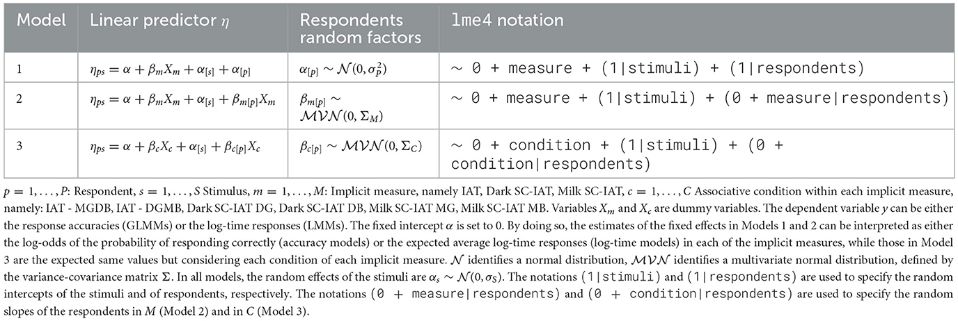 To account for the fully-crossed structures and the within-subjects experimental design, the linear combination of predictors in the (G)LM needs to be extended to include the random effects related to the respondents, the stimuli, the implicit measures, and the associative conditions within the implicit measures (Epifania et al., 2024). The distribution of the random effects is estimated as a multivariate normal distribution (i.e., ) with mean 0 and a variance-covariance matrix Σ that is determined by the vector of parameters of the random effects Γ (Doran et al., 2007). The dimension of Γ is usually rather small, and its size derives from the number of random factors specified in the model, regardless of the number of levels they include. The Rasch-like estimates are derived by combining the estimates of the fixed effects with the best linear unbiased predictors, (BLUPs Doran et al., 2007). The BLUPs describe the deviation of each level of the random effects from the fixed effects. As such, person-level estimates are influenced by the specific random-effects structure used in the model, which is designed to capture the variability present in the data. Differently from the usual scoring methods of implicit measures that concurrently account for the response times and the accuracies (the error responses are given a penalty), this modeling approach separately considers the information that can be gathered from the accuracy performance and the time performance of the respondents. The person-levels estimates of the best fitting models are used for predicting the behavioral choice and their performance is compared against that of the typical scoring methods.