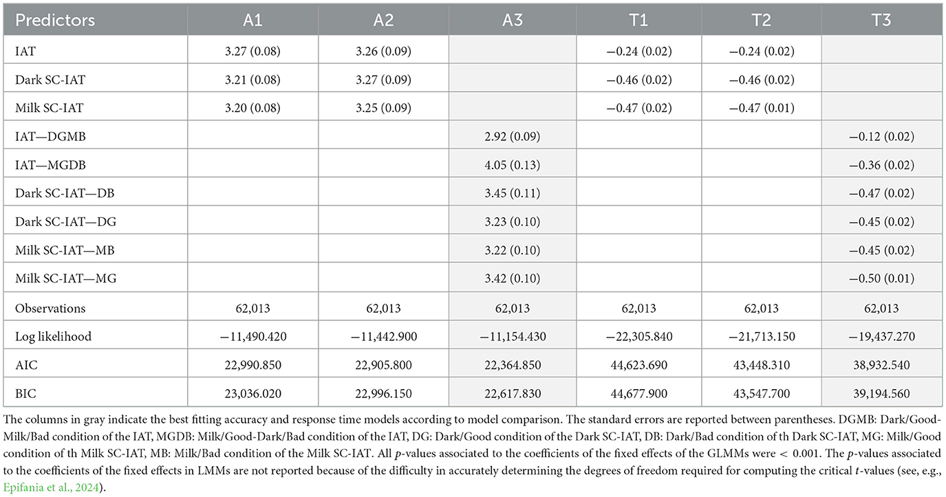 The results on the fixed effects of Model A3 indicate that the associative conditions where milk chocolate was associated with positive attributes and dark chocolate was associated with negative attributes (i.e., IAT—MGDB, Milk SC-IAT—MG, Dark SC-IAT—DB) tended to be easier than their respective counterparts (i.e., IAT—DGMB, Milk SC-IAT—MB, Dark SC-IAT—DG). Nonetheless, the results on the fixed effects of GLMMs should be taken with caution unless robust statistics are used to obtain the p-values (see e.g., Andreella et al., 2025). Similar results were observed on the log-time responses, such that responses tended to be faster when milk chocolate was associated with positive attributes and dark chocolate was associated with negative attributes than in the respective contrasting conditions. For both accuracies and log-transformed response times, greater variability between conditions was observed in the IAT compared to the SC-IAT, where the coefficients for the associative conditions were more similar. This suggests that the performance of the respondents is more strongly influenced by the associative conditions in the IAT than in the SC-IAT.
