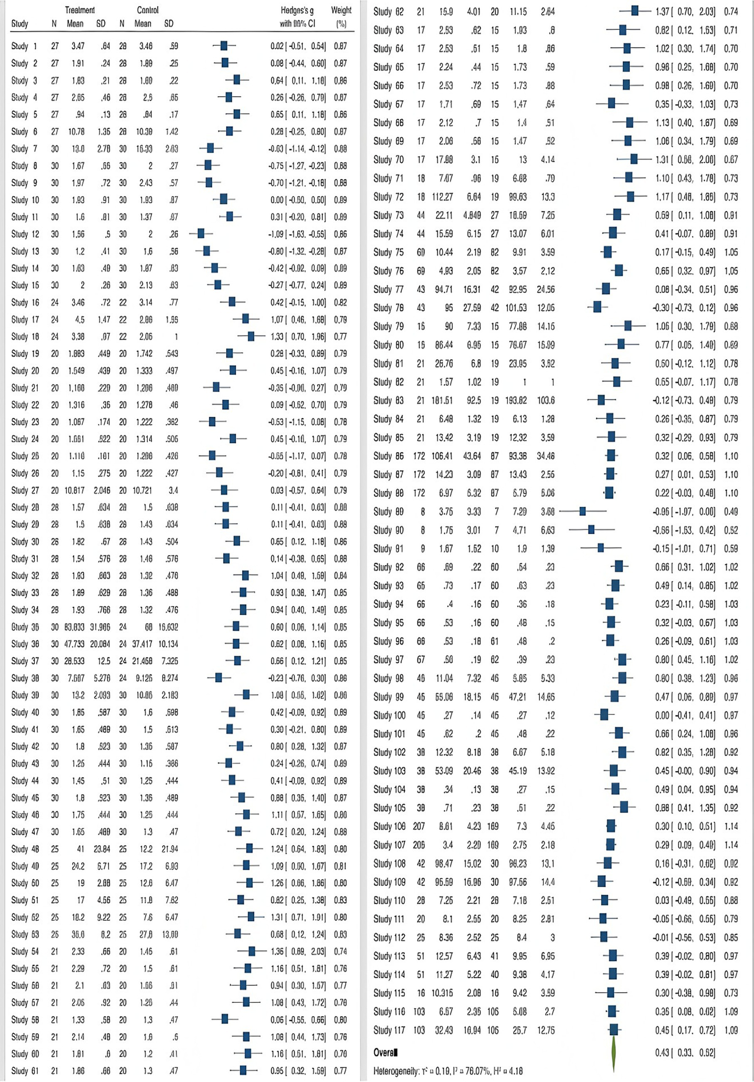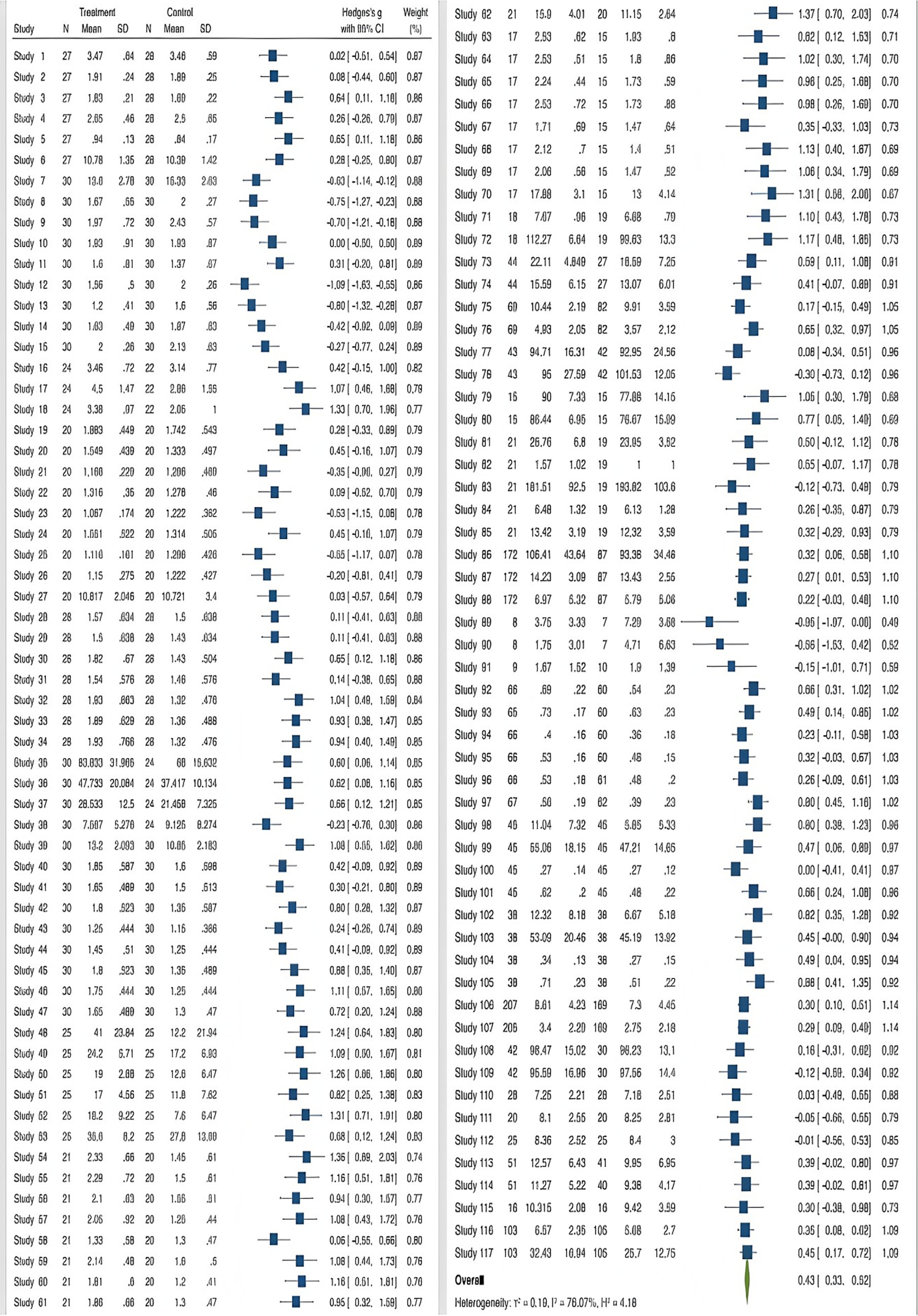 In this study, Stata17.0 software was used for meta-analysis, Hedges’ g was used as the effect size, forest map, heterogeneity test, publication bias and other functions in the meta-analysis menu were used for analysis, and random effects model was selected. This study was composed of 25 interactive reading experiments with 123 effect sizes to explore the effects of interactive reading on children’s narrative ability at different ages, different intervention duration and different interactive objects.
