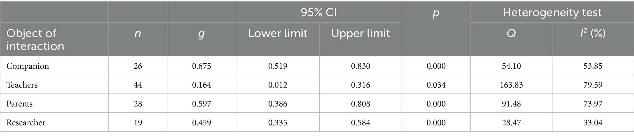 Table 3 demonstrates significant facilitative effects of all four pedagogical agents on children’s narrative competence (g > 0, p < 0.01). Effect magnitude stratification reveals peer interaction as the most potent predictor [g = 0.675, 95% CI (0.519, 0.830)], exceeding Cohen’s large-effect threshold (0.5–1.0). Subsequent predictors include parental engagement (g = 0.597) and researcher facilitation (g = 0.459), with teacher-guided interaction demonstrating modest efficacy (g = 0.164). This hierarchy suggests that peer-mediated linguistic scaffolding—characterized by reciprocal discourse patterns, observational learning mechanisms, and low-affect communication contexts—optimally catalyzes narrative development. While parental, researcher, and pedagogical inputs remain valuable, their differential efficacy necessitates strategically diversified interventions prioritizing peer dyads and family participation.