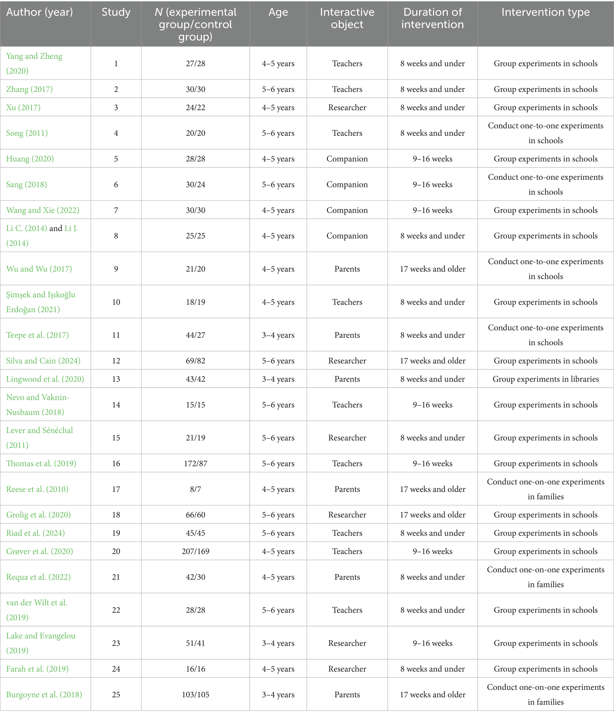 Experimental studies related to this topic are screened out, disputes existing in existing literature are discussed, and the regulating effects of children’s age, interactive objects and intervention duration are further analyzed. Therefore, according to existing research contents, this study mainly discusses the following questions: