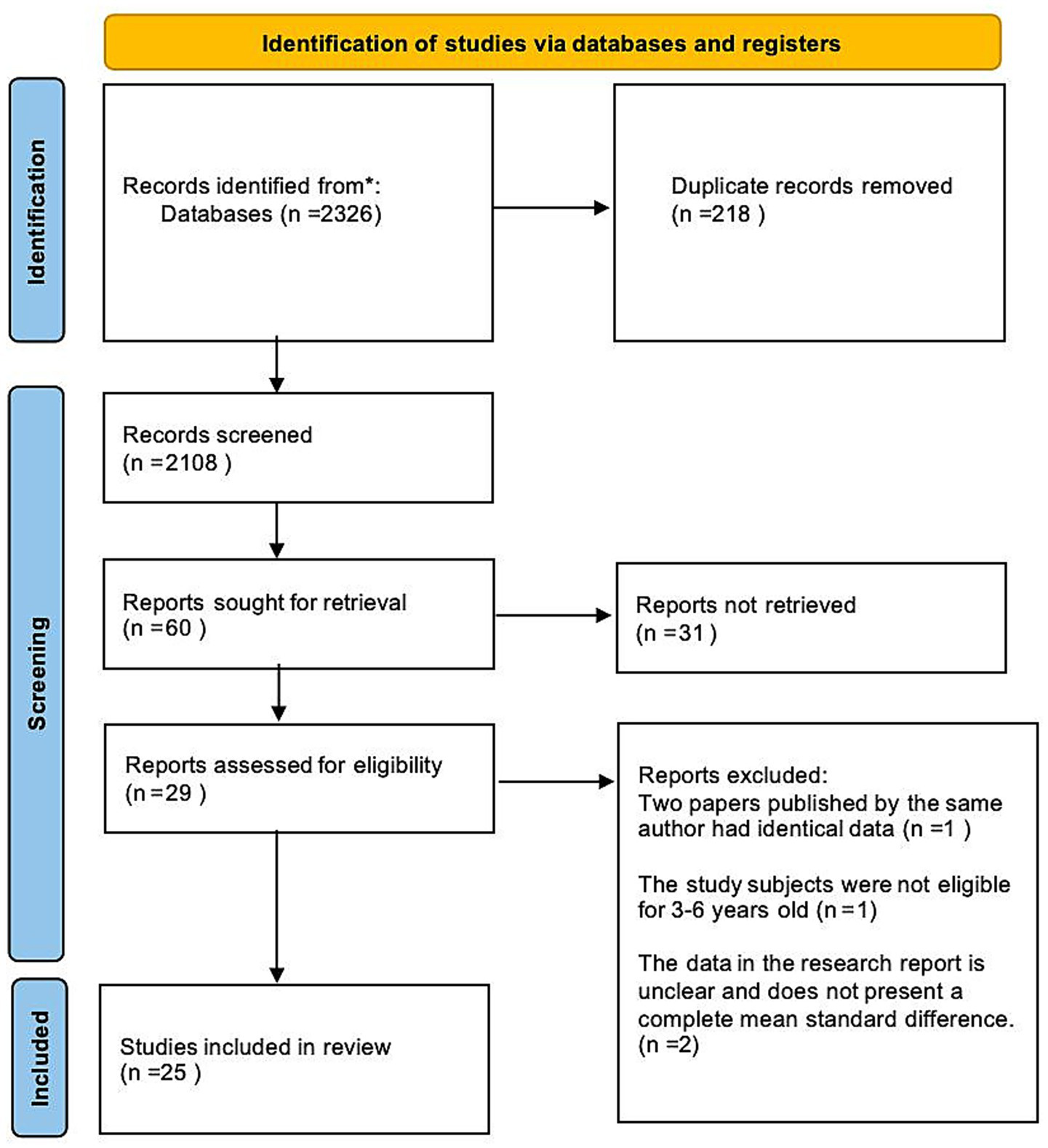 Systematic review and meta-analysis were carried out in accordance with the PRISMA guidelines. Chinese literature was retrieved from CNKI, while English literature was sourced from the Web of Science, Science Direct, SpringerLink, Taylor & Francis, Wiley, and the ERIC electronic databases. At the same time, the method of literature backtracking was used for literature supplementary search. Three sets of keywords were used to search: (1) [“Young children” OR “preschoolers” OR “infants” OR “toddlers” OR “Child” OR “children”]; (2) [“shared book reading (SBR) “OR “shared reading” OR “interactive reading” OR “dialogic reading” OR “conversational reading”]; (3) [“narrative ability” OR “Oral Narrative” OR “Storytelling” OR “Narrative Skills” OR “Oral Narrative” OR “Narrative Skills”]. The two coders searched a total of 2,326 relevant studies in the database, deleted 218 duplicate data, and left 2,108 references. After reading the literature in strict accordance with the inclusion criteria, 2079 literatures were excluded, leaving 29 qualified reports. Among the 29 studies, after careful reading again, one study with the same data published by the same author was excluded, one study whose subjects were not between the ages of 3–6 years old was excluded, and two studies with unclear data and incomplete mean and standard deviation were excluded. Finally, the remaining 25 studies were included in the analysis (see Figure 1).