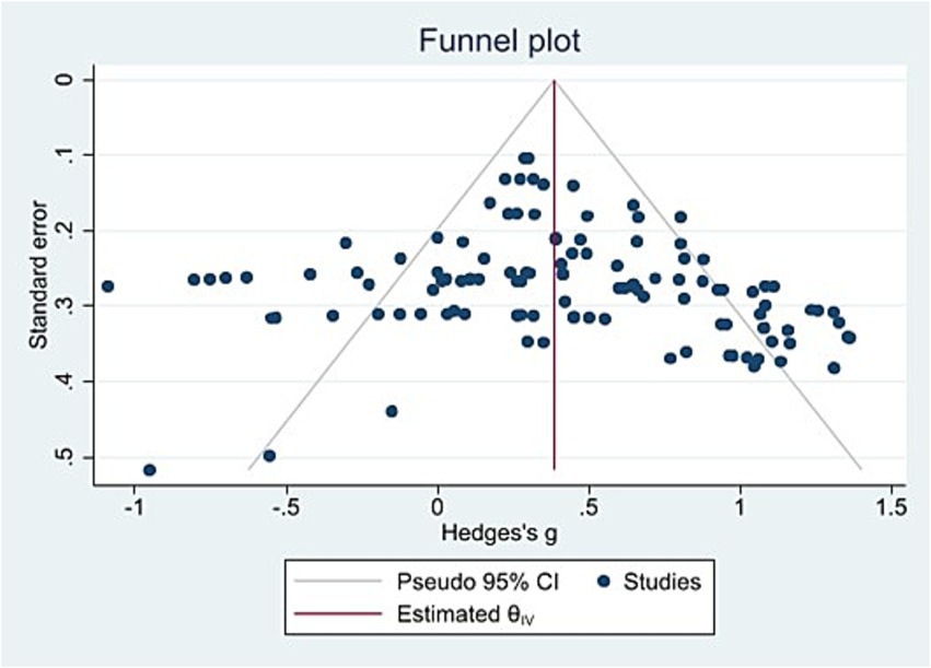 Publication bias refers to the fact that the results of “statistically significant” positive studies in existing studies are more likely to be published than those of “statistically significant” negative studies, resulting in a bias in the results of meta-analysis. The funnel plot method and Egger method were used in this study to test for publication bias. In the detection of funnel plot method, if there is no publication bias, the scatter points of funnel plot will be symmetrically distributed around the true value and tend to be concentrated in a narrow range. From the funnel plot of this study, as shown in Figure 2, the scatter-point distribution of the effect values of independent studies included in the study had no obvious asymmetry, and most of them were in the middle region of the funnel plot and relatively evenly distributed on both sides of the median line, indicating that the possibility of publication bias was small. At the same time, the Egger linear regression test results show that the t value is 1.76 and the p-value is 0.0803 (p > 0.05), indicating that there is no publication bias in this study and the meta-analysis results are relatively stable and reliable.