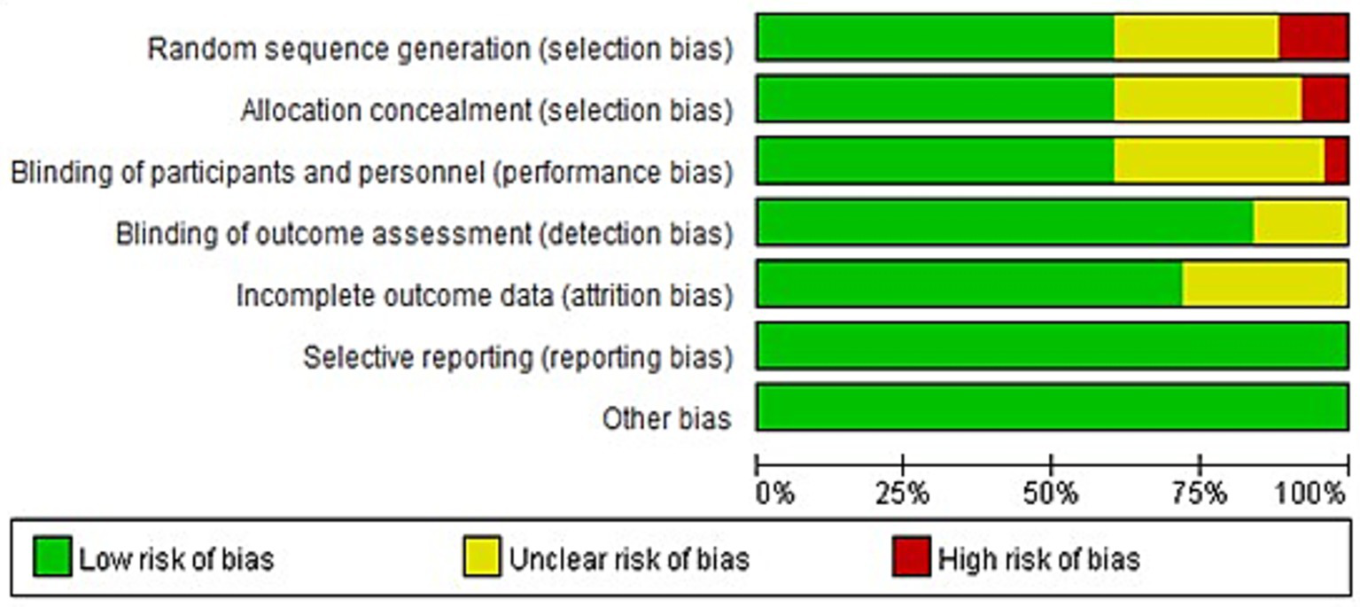 The Cochrane risk of bias assessment tool in Revman software was used to evaluate the quality of the literature included in the meta-analysis, mainly from six areas, including selection bias, measurement bias, follow-up bias, reporting bias, implementation bias and other bias. For each indicator, high risk of bias, low risk of bias and uncertainty of bias were used to evaluate, as shown in Figure 4. If all the literatures are low-risk in the evaluation process, the quality grade of the literatures is grade A, and the possibility of bias is the least. If the risk is unknown in the process of literature evaluation, the quality grade of the paper is B, and there is a medium possibility of bias. In the evaluation process, as long as one item is high risk, the quality of the paper is level C, with a high possibility of bias (Liao et al., 2023). According to the results of bias risk assessment, there were 7 articles with grade A quality, 15 articles with grade B quality, and 3 articles with grade C quality. Among them, 10 literatures were not rigorous enough in randomization, could not specify the way of randomization, or simply grouped children according to the order of participation; In 10 papers, there were loopholes in allocation and hiding. The literature lacked descriptions of whether the groups were hidden or not, or there was the possibility that children, trainers and researchers could know the grouping situation. In 9 literatures, it was not possible to determine whether blind or incomplete blind method was implemented. In 3 literatures, there was the possibility of incomplete outcome data in the scale scoring of children; and 7 articles were uncertain about the existence of incomplete outcome data. Overall, the overall level of literature quality was good.