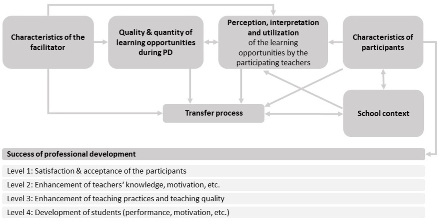 The ways in which PD offerings are perceived and utilized largely depend on the individual preconditions of participants (Lipowsky and Rzejak, 2021). These in turn affect the transfer of training content into practice, and thereby the success of the PD. However, contextual factors such as systemic conditions, institutional structures, or regulations remain largely unaddressed in the offer-and-use model. Those factors are outlined for example by Geijsel et al. (2009) and Krille (2020). By doing so, context conditions as the school environment (size, cooperation, or school requirements) and factors of the profession itself which influences the (possibility of) participation on a PD (teaching and work load, or potential class cancelation) are highlighted as important as the individual characteristics of the teachers or the PD program.